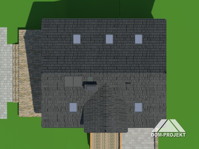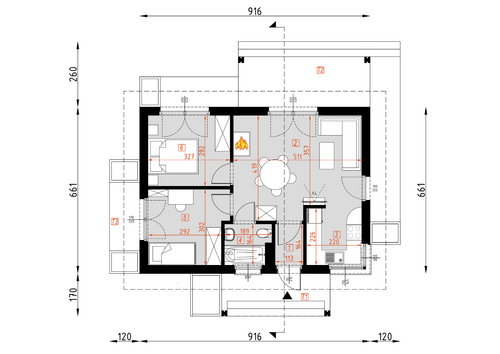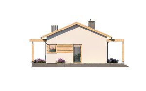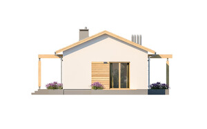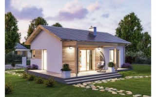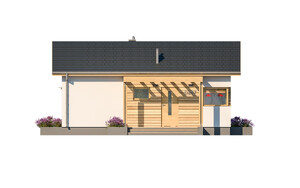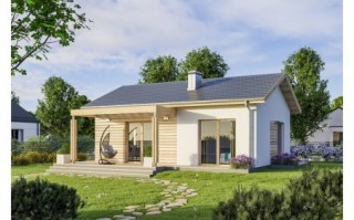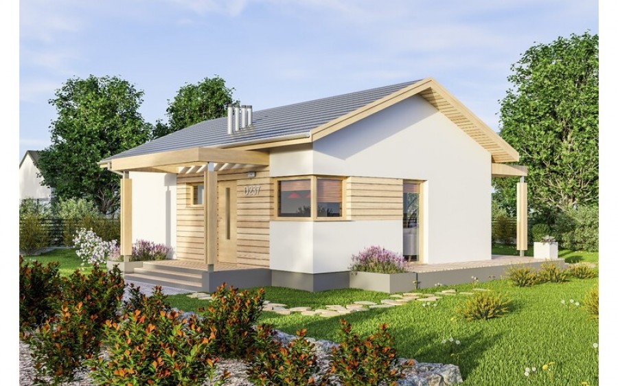 Nowoczesny, mały dom parterowy. Projekt domu oferuje dwa pokoje sypialniane, przestronny pokój dzienny połączony z kuchnią oraz łazienkę. Atutem domu są dwa duże tarasy.