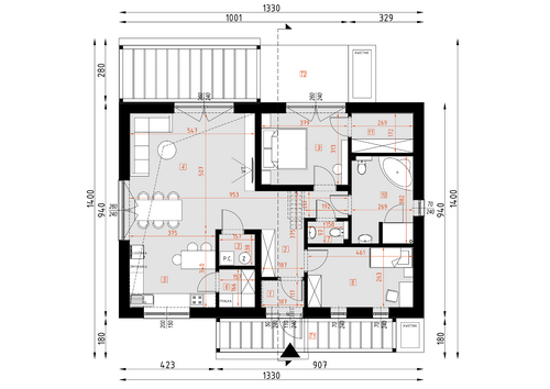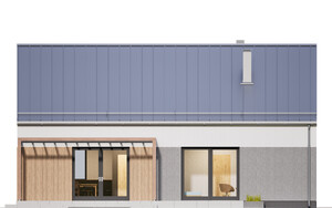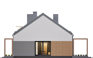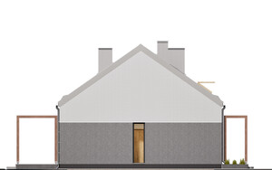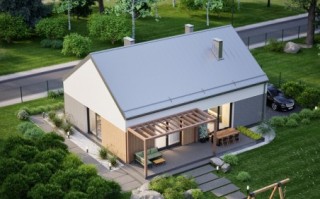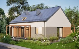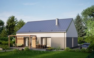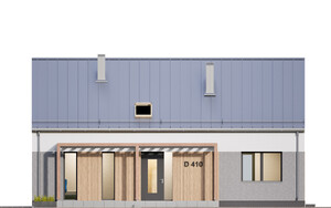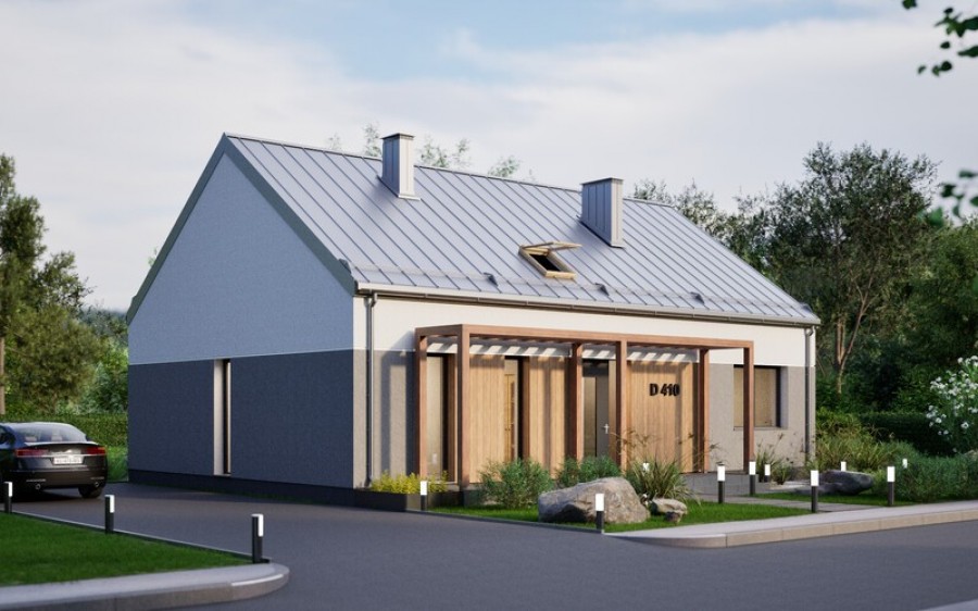 D410 to nowoczesny parterowy dom w technologii murowanej, bezokapowy, z otwarciem nad salonem i kuchnią, nad pozostałą częścią poddasze nieużytkowe.