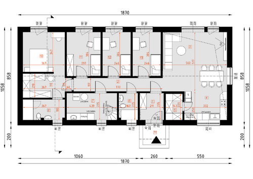 D406 dom parterowy w technologii murowanej w typie nowoczesnej stodoły, z otwarciem nad pokojem dziennym.