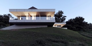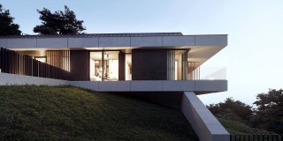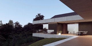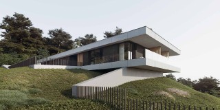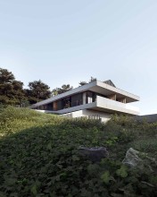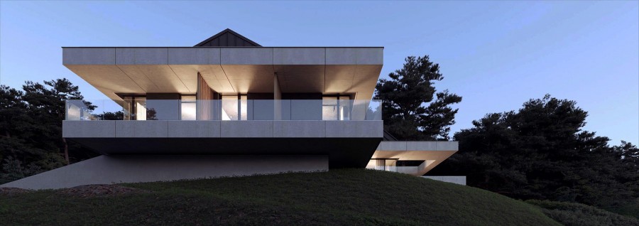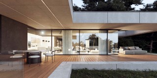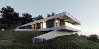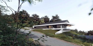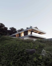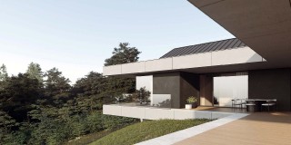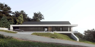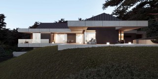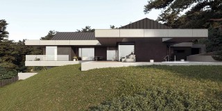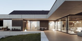 Architektura domu wyróżnia się eleganckim połączeniem dachu dwuspadowego z dachami płaskimi i zadaszeniami tarasów. Wykończenie z najwyższej jakości materiałów, takich jak blacha na rąbek stojący, spieki kwarcowe i płyty włókno-cementowe, gwarantuje trwałość i estetykę na lata.
