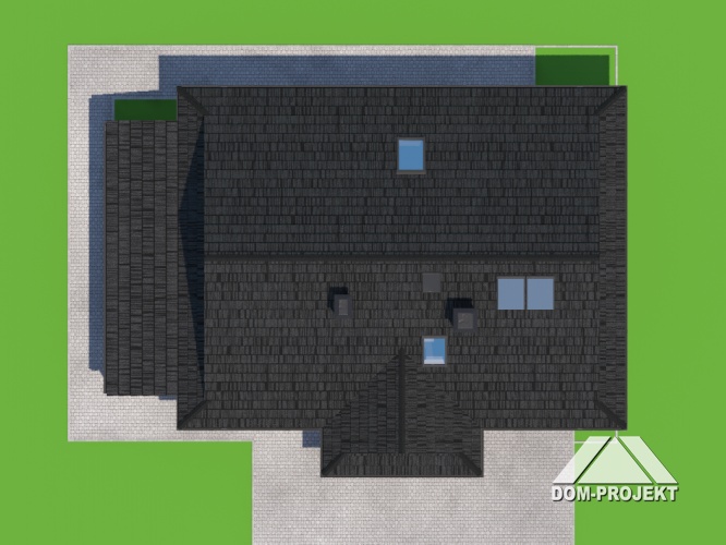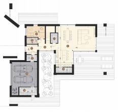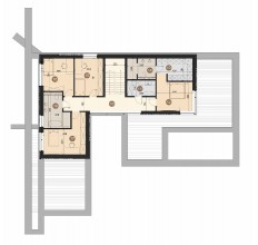 Część piętra została ukształtowana tak, aby tworzyła zadaszone podcienie nad głównym tarasem oraz wejściem do budynku. W środku znajdziesz imponujący salon z dużymi przeszkleniami, które łączą wnętrze z ogrodem. Dzięki odpowiednio zaprojektowanym zadaszeniom możesz cieszyć się światłem dziennym, jednocześnie kontrolując jego intensywność.