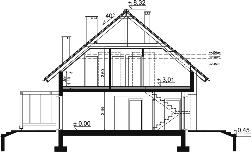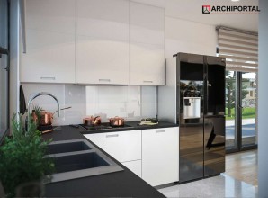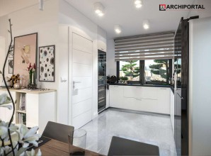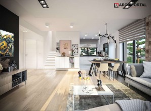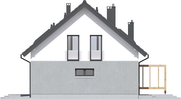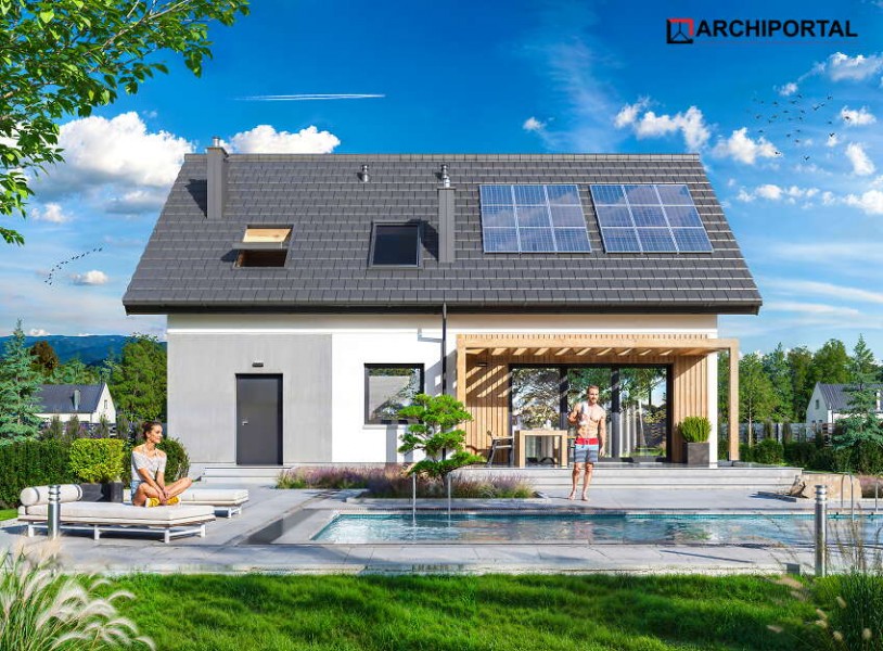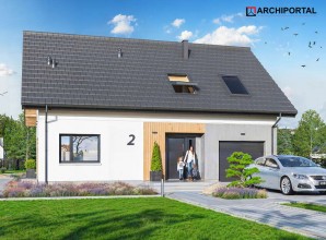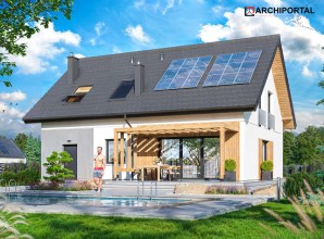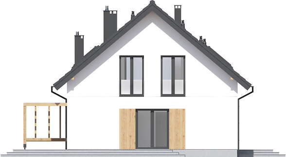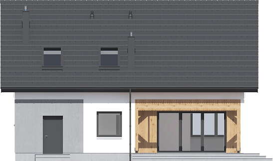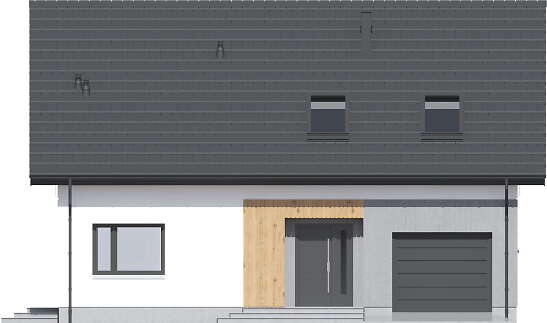 Dom ma nieskomplikowaną bryłę i prosty, dwuspadowy dach, co niewątpliwie będzie miało istotny wpływ na obniżenie kosztów budowy. Elewację budynku wykończono w nowoczesnym stylu, łącząc biel tynku, grafitowy kolor stolarki i dachówki oraz modne okładziny drewniane