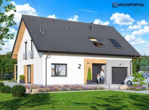 Projekt nowoczesnego domu z poddaszem użytkowym i wbudowanym garażem, który łączy w sobie funkcjonalność oraz nowoczesny design. Budynek ma do zaoferowania bardzo dużo przestrzeni. Na parterze znalazły się: spory wiatrołap, kuchnia, przestronny salon, praktyczna spiżarnia, łazienka, garaż, duża kotłownia oraz dodatkowy pokój, który można przeznaczyć np. na gabinet. W budynku zaprojektowano 2 rodzaje ogrzewania: piec na BIOMASĘ oraz POMPĘ CIEPŁA. Inwestor ma w ten sposób wybór i może zdecydować, które ogrzewania zastosować w swoim domu. Pakiet z pompą ciepła zawiera dodatkowo projekt ogrzewania podłogowego oraz projekt instalacji fotowoltaicznej. Poddasze to typowa strefa nocna, znalazły się tutaj aż cztery sypialnie. Dzięki podwyższonej ściance kolankowej pokoje mają sporo przestrzeni i są bardzo ustawne. Jedna z sypialni posiada własną garderobę. Dodatkowym atutem jest przestronna łazienka z miejscem na wannę i prysznic oraz spore pomieszczenie gospodarcze, które pełni rolę pralni.