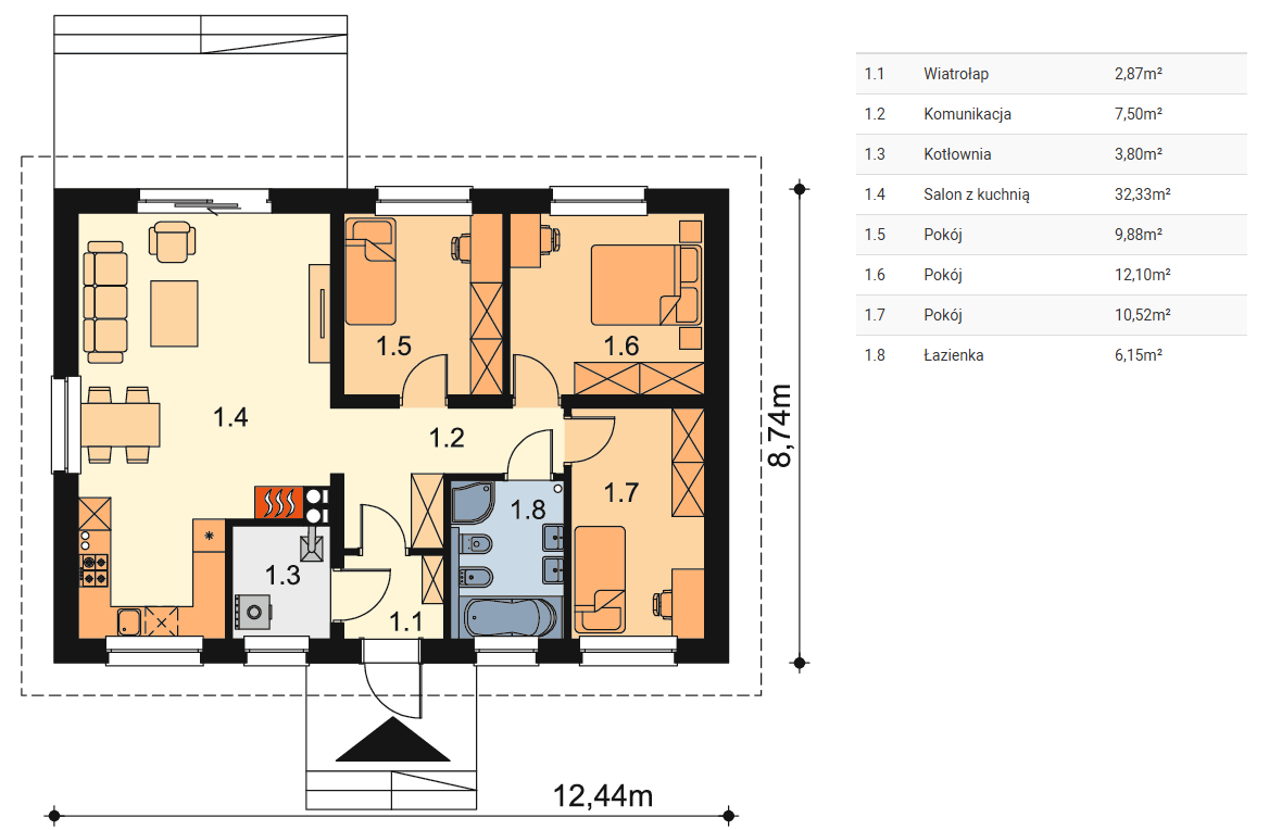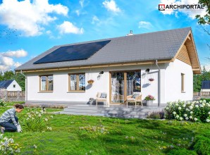 Tebe Energo to niewielki dom parterowy, który charakteryzuje się z jednej strony prostotą rozwiązań, z drugiej – niezwykłą funkcjonalnością i praktycznością. Pod dostatkiem miejsca znajdzie tu 3-4 osobowa rodzina. Do dyspozycji mieszkańców zaplanowano przestronny salon połączony z otwartą kuchnią, 3 ustawne pokoje, kotłownię oraz sporą łazienkę z miejscem na wannę i prysznic. W budynku zaprojektowano dwa rodzaje ogrzewania: przy pomocy pieca na gaz oraz POMPY CIEPŁA. Inwestor ma w ten sposób wybór i może zdecydować, które ogrzewanie zastosować w swoim domu. Pakiet z pompą ciepła zawiera dodatkowo projekt ogrzewania podłogowego oraz projekt instalacji fotowoltaicznej. Centralnie położony kominek może się natomiast przydać zimą, jako dodatkowe źródło ogrzewania. Dom ma prostą bryłę i nieskomplikowany dach co na pewno wpłynie na obniżenie kosztów budowy. Elewację budynku można wykończyć zarówno w klasycznym, jak również nowoczesnym stylu, stosując np. modne okładziny drewniane lub drewnopodobne.