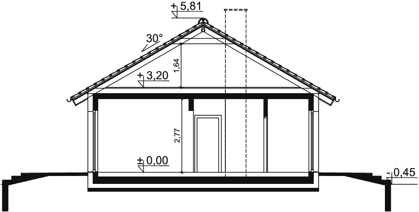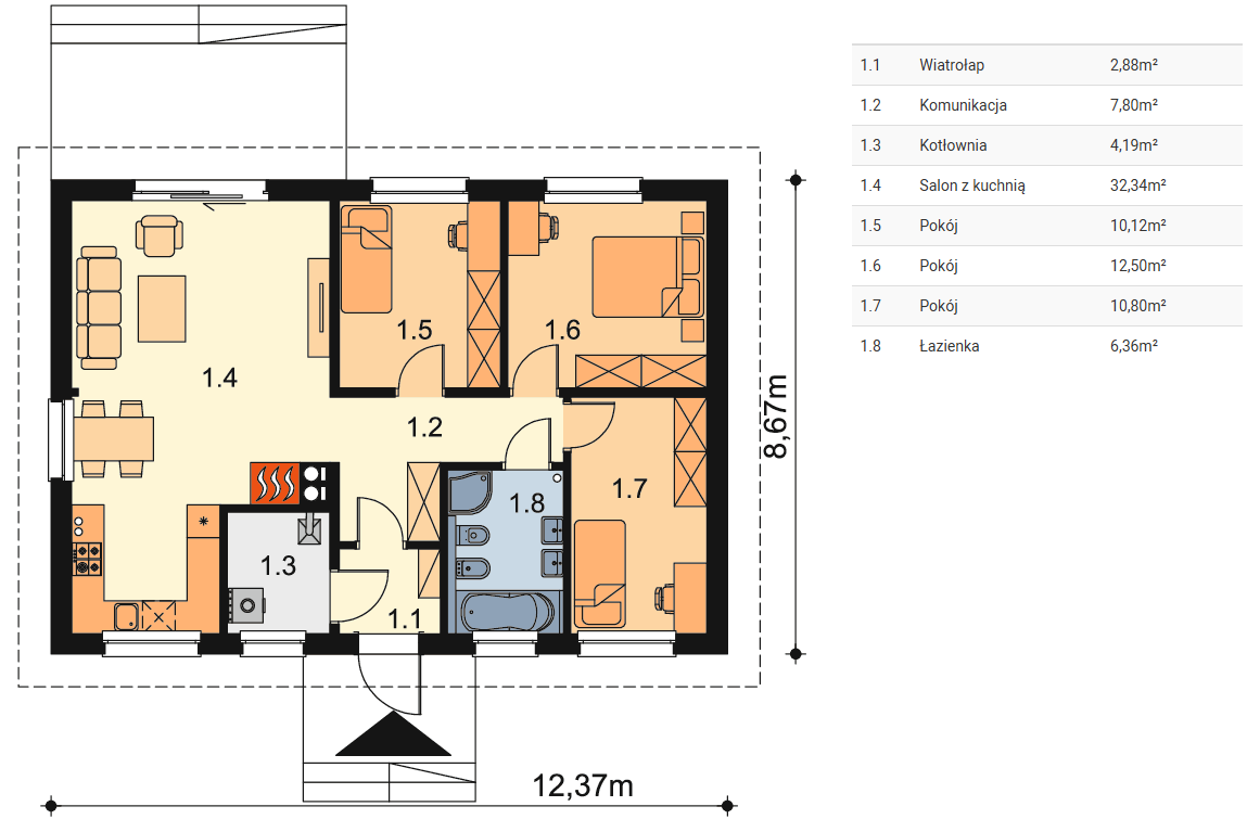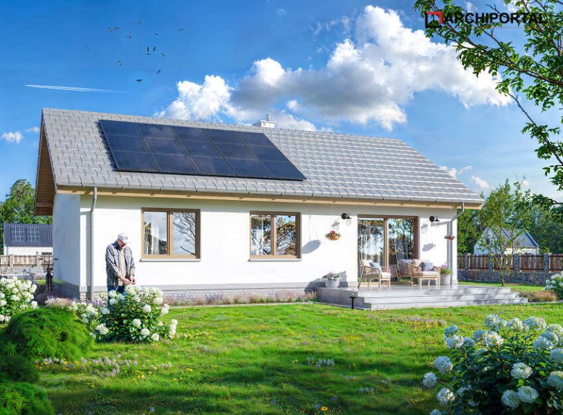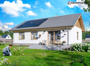 Tebe szkielet drewniany to wersja popularnego domu, zaprojektowanego w technice szkieletowej. Budynek może spełniać rolę zarówno domu całorocznego, jak i letniskowego. Charakteryzuje się on z jednej strony prostotą rozwiązań, z drugiej – niezwykłą funkcjonalnością i praktycznością. Pod dostatkiem miejsca znajdzie tu 3-4 osobowa rodzina. Do dyspozycji mieszkańców zaplanowano przestronny salon połączony z otwartą kuchnią, 3 ustawne pokoje, kotłownię oraz sporą łazienkę z miejscem na wannę i prysznic. W budynku zaprojektowano dwa rodzaje ogrzewania: przy pomocy pieca na gaz oraz POMPY CIEPŁA. Inwestor ma w ten sposób wybór i może zdecydować, które ogrzewanie zastosować w swoim domu. Pakiet z pompą ciepła zawiera dodatkowo projekt ogrzewania podłogowego oraz projekt instalacji fotowoltaicznej. Centralnie położony kominek może się natomiast przydać zimą, jako dodatkowe źródło ogrzewania. Dom ma prostą bryłę i nieskomplikowany dach, a zaprojektowanie go w technice szkieletowej będzie miało niewątpliwy wpływ na obniżenie kosztów budowy. Elewację budynku można wykończyć zarówno w klasycznym, jak również nowoczesnym stylu, stosując np. modne okładziny drewniane lub drewnopodobne.