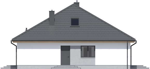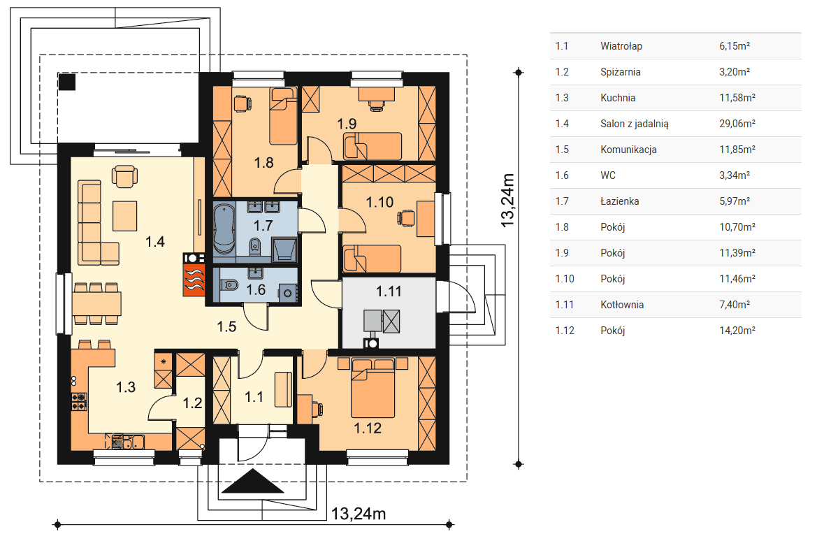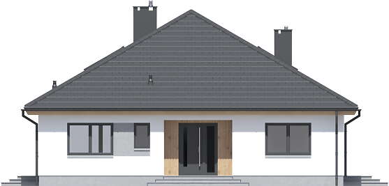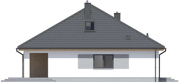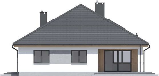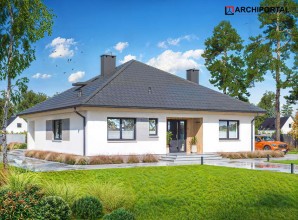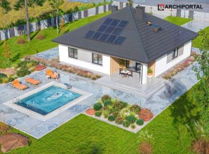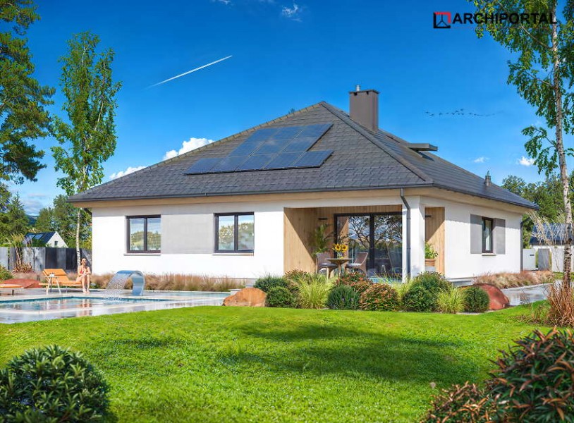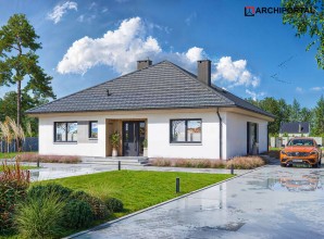 Projekt domu TRYTON 6 to nowoczesny, parterowy dom jednorodzinny, który łączy w sobie elegancję i funkcjonalność, oferując przestronne i komfortowe wnętrza. Dzięki czterospadowemu dachowi, dom zyskuje wyjątkowy charakter, który doskonale wpisuje się we współczesny styl architektoniczny. Do budynku dostajemy się przez spory wiatrołap, który prowadzi nas wprost do przestronnego korytarza. Strefa dzienna to duży, dobrze oświetlony salon, połączony z jadalnią i otwartą kuchnią. Jest ona na tyle duża, że pomieści ciąg praktycznych blatów roboczych, a w jej pobliżu zaprojektowano sporą spiżarnię. Dom oferuje aż cztery wygodne sypialnie, łazienkę z miejscem na wannę i prysznic oraz toaletę. Z korytarza dostaniemy się też do dużej kotłowni z bezpośrednim wyjściem na zewnątrz, w której zaprojektowano dwa rodzaje ogrzewania: kocioł na BIOMASĘ oraz POMPĘ CIEPŁA. Inwestor ma w ten sposób wybór i może zdecydować, które ogrzewania zastosować w swoim domu. Pakiet z pompą ciepła zawiera dodatkowo projekt ogrzewania podłogowego oraz projekt instalacji fotowoltaicznej. Kominek położony centralnie w salonie może się natomiast przydać zimą, jako dodatkowe źródło ogrzewania.