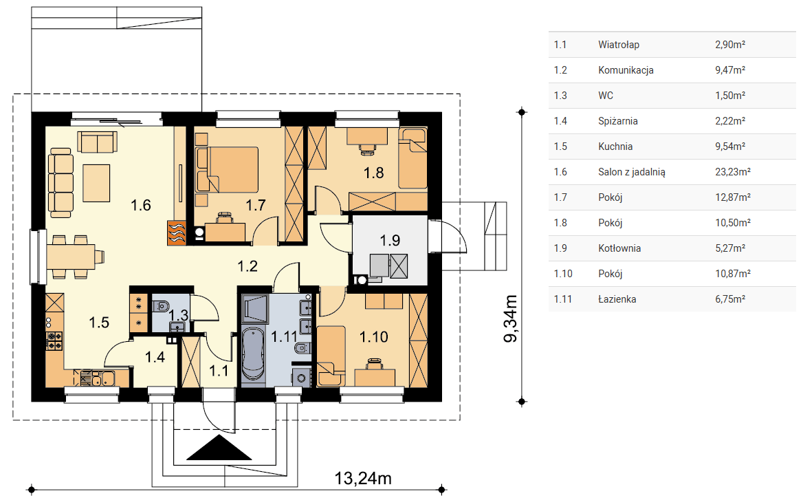 Tracja 10 to projekt domu o powierzchni użytkowej poniżej 90m², który charakteryzuje się z jednej strony prostotą rozwiązań, z drugiej – niezwykłą funkcjonalnością i praktycznością. Pod dostatkiem miejsca znajdzie tu 3-4 osobowa rodzina. Do dyspozycji mieszkańców poza przestronnym salonem połączonym z otwartą kuchnią są: 3 ustawne pokoje, łazienka, z miejscem na wannę i prysznic, toaleta, spiżarnia oraz spora kotłownia z bezpośrednim wyjściem na zewnątrz. W kotłowni zaprojektowano 2 rodzaje ogrzewania: na paliwo stałe (biomasę) oraz przy pomocy POMPY CIEPŁA. Inwestor ma w ten sposób wybór i może zdecydować, które ogrzewania zastosować w swoim domu. Pakiet z pompą ciepła zawiera dodatkowo projekt ogrzewania podłogowego oraz projekt instalacji fotowoltaicznej. Centralnie położony kominek w salonie może się natomiast przydać zimą, jako dodatkowe źródło ogrzewania. Dom ma prostą bryłę i nieskomplikowany dach, do tego tradycyjny strop drewniany, co będzie miało niewątpliwy wpływ na obniżenie kosztów budowy. Elewację budynku można wykończyć zarówno w klasycznym, jak również nowoczesnym stylu, stosując np. modne okładziny drewniane lub drewnopodobne.
