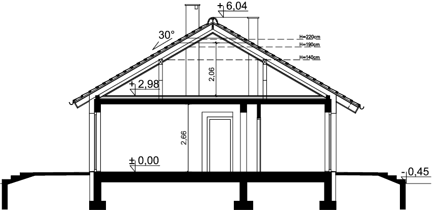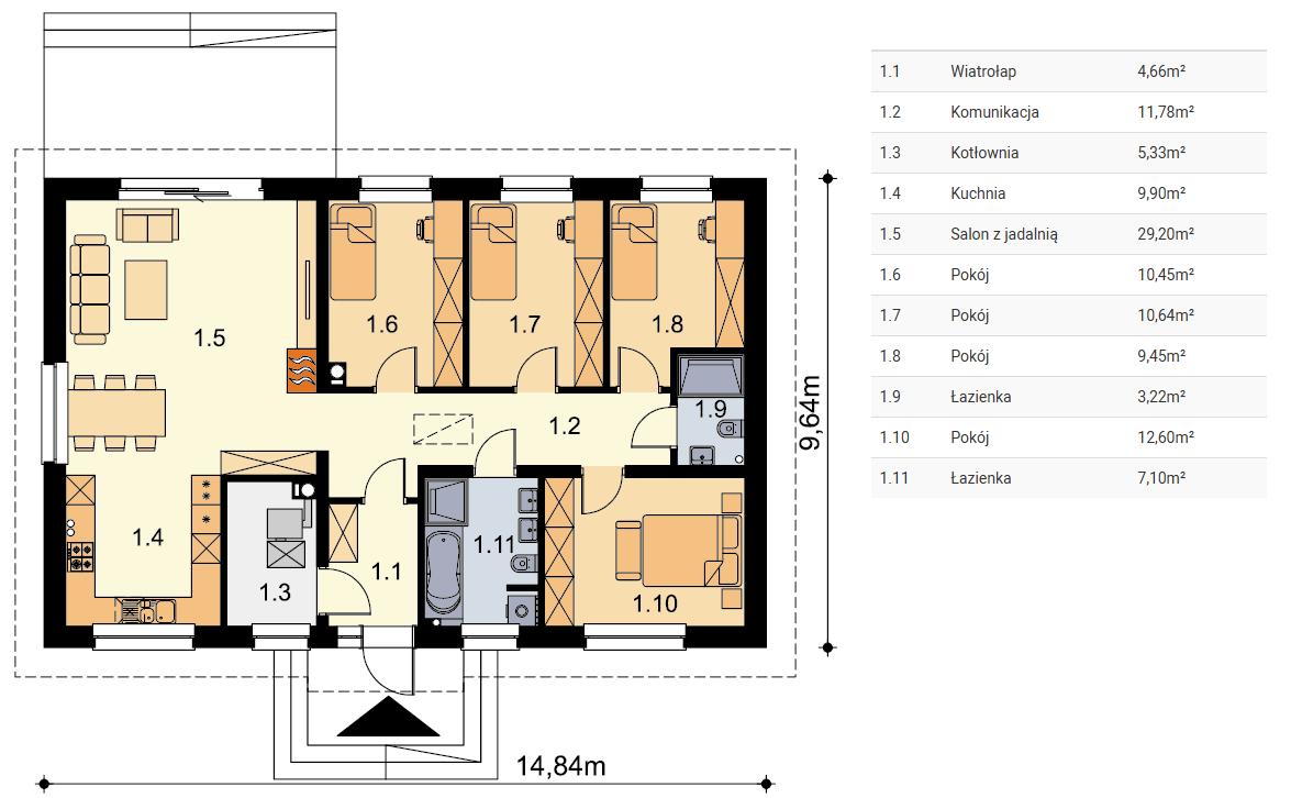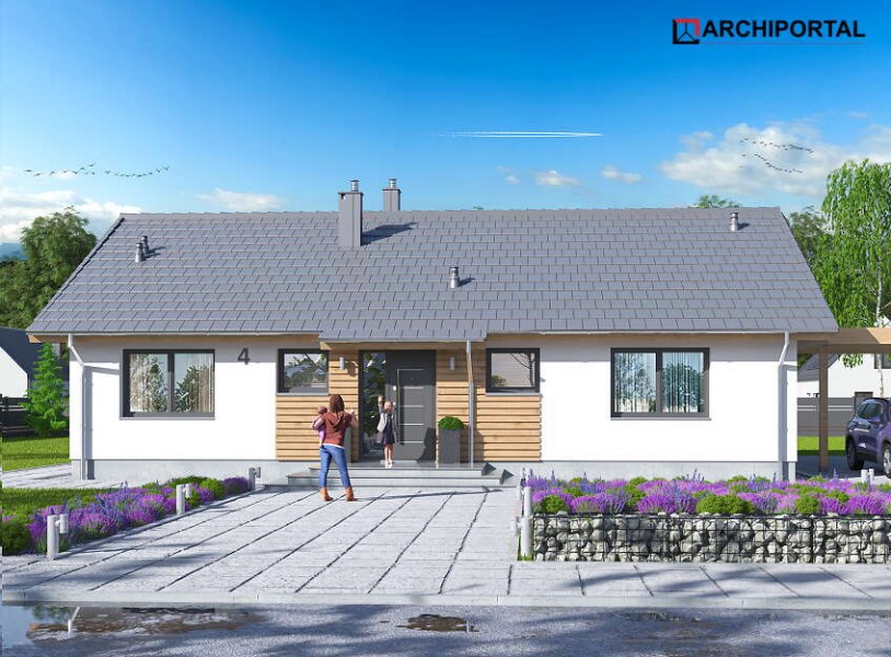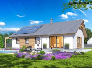 Tebe 6 to idealna propozycja dla Inwestorów, którzy szukają domu o prostej, minimalistycznej bryle, taniego w budowie, z dobrze zaplanowanym wnętrzem i maksymalnie wykorzystaną przestrzenią. Do wnętrza dostajemy się poprzez spory wiatrołap, który prowadzi nas wprost do części komunikacyjnej budynku. Na strefę dzienną składają się duży, przestronny, dobrze oświetlony salon, połączony z jadalnią i otwartą kuchnią. Kuchnię zaprojektowano w klasycznej zabudowie litery „u”, a duża ilość blatów roboczych i możliwość ustawienie wielu sprzętów, są jej niewątpliwym atutem. Strefa nocna to 4 ustawne pokoje i dwie łazienki. Większa łazienka bez trudu pomieści wannę, prysznic oraz pralkę. W korytarzu zaprojektowano schody składane prowadzące na spory strych, który stanowi dodatkową przestrzeń do przechowywania. W budynku zaprojektowano dwa rodzaje ogrzewania: przy pomocy pieca na biomasę oraz POMPY CIEPŁA. Inwestor ma w ten sposób wybór i może zdecydować, które ogrzewania zastosować w swoim domu. Pakiet z pompą ciepła zawiera dodatkowo projekt ogrzewania podłogowego oraz projekt instalacji fotowoltaicznej. Centralnie położony kominek w salonie może się natomiast przydać zimą, jako dodatkowe źródło ogrzewania. Elewację budynku można wykończyć zarówno w klasycznym, jak również nowoczesnym stylu, stosując np. modne okładziny drewniane lub drewnopodobne.