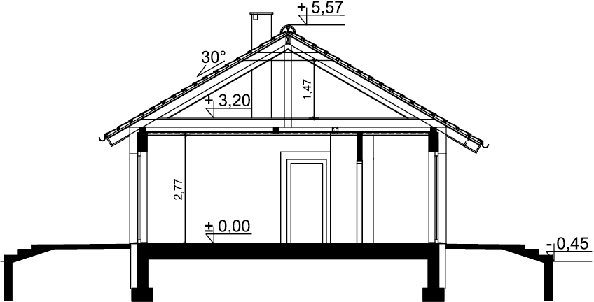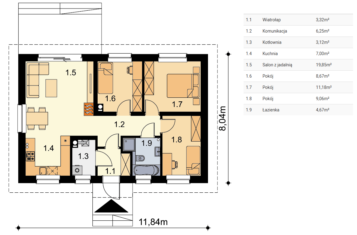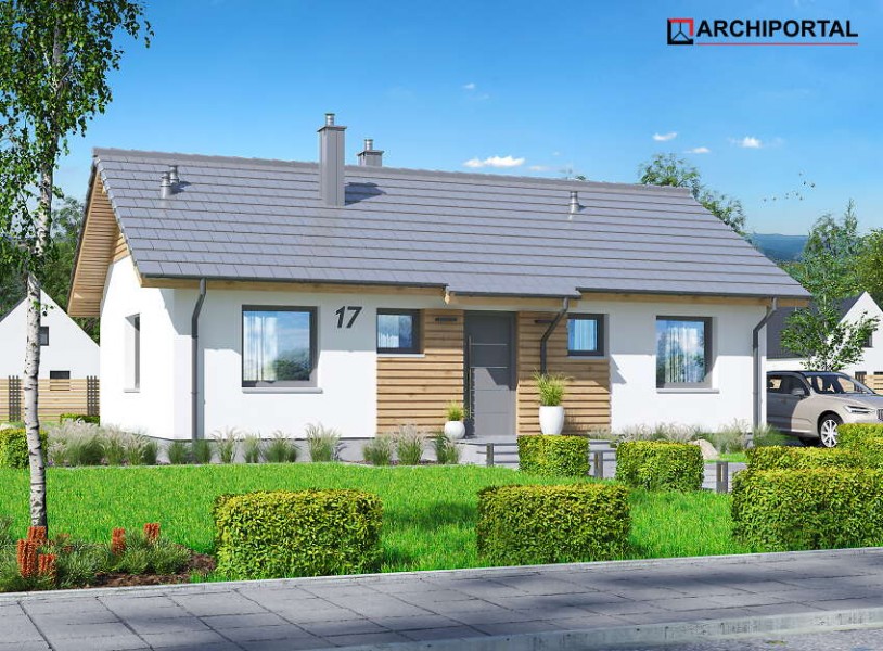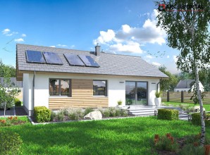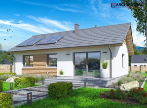 Mały, uroczy domek, który charakteryzuje się z jednej strony prostotą rozwiązań, z drugiej – niezwykłą funkcjonalnością i praktycznością. Pod dostatkiem miejsca znajdzie tu 3-4 osobowa rodzina. Do dyspozycji mieszkańców poza przestronnym salonem połączonym z otwartą kuchnią są: 3 ustawne pokoje, łazienka, z miejscem na wannę i prysznic oraz kotłownia, w której zaprojektowano 2 rodzaje ogrzewania: na gaz oraz przy pomocy POMPY CIEPŁA. Inwestor ma w ten sposób wybór i może zdecydować, które ogrzewania zastosować w swoim domu. Pakiet z pompą ciepła zawiera dodatkowo projekt ogrzewania podłogowego oraz projekt instalacji fotowoltaicznej. Centralnie położony kominek w salonie może się natomiast przydać zimą, jako dodatkowe źródło ogrzewania. Dom ma prostą bryłę i nieskomplikowany dach, do tego klasyczny strop drewniany, co będzie miało niewątpliwy wpływ na obniżenie kosztów budowy. Elewację budynku można wykończyć zarówno w klasycznym, jak również nowoczesnym stylu, stosując np. modne okładziny drewniane lub drewnopodobne.