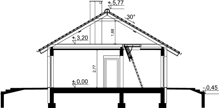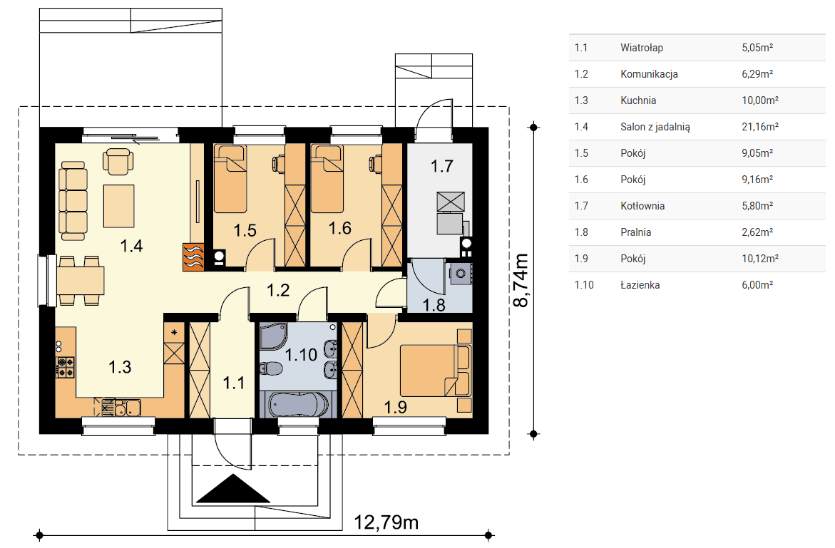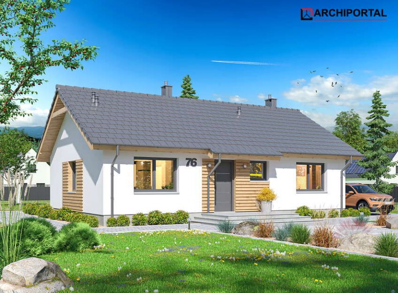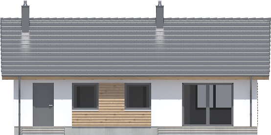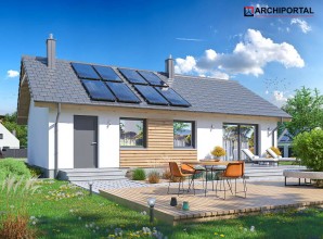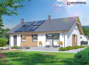 Tracja 9 to projekt domu o powierzchni użytkowej poniżej 80 m2, który charakteryzuje się z jednej strony prostotą rozwiązań, z drugiej – niezwykłą funkcjonalnością i praktycznością. Pod dostatkiem miejsca znajdzie tu 3-4 osobowa rodzina. Do dyspozycji mieszkańców poza przestronnym salonem połączonym z otwartą kuchnią są: 3 ustawne pokoje, łazienka, z miejscem na wannę i prysznic, pralnia oraz spora kotłownia z bezpośrednim wyjściem na zewnątrz. W kotłowni zaprojektowano 2 rodzaje ogrzewania: na paliwo stałe (biomasę) oraz przy pomocy POMPY CIEPŁA. Inwestor ma w ten sposób wybór i może zdecydować, które ogrzewania zastosować w swoim domu. Pakiet z pompą ciepła zawiera dodatkowo projekt ogrzewania podłogowego oraz projekt instalacji fotowoltaicznej. Centralnie położony kominek w salonie może się natomiast przydać zimą, jako dodatkowe źródło ogrzewania. Dom ma prostą bryłę i nieskomplikowany dach, do tego klasyczny strop drewniany, co będzie miało niewątpliwy wpływ na obniżenie kosztów budowy. Elewację budynku można wykończyć zarówno w klasycznym, jak również nowoczesnym stylu, stosując np. modne okładziny drewniane lub drewnopodobne.