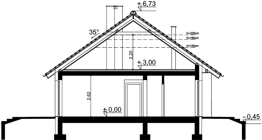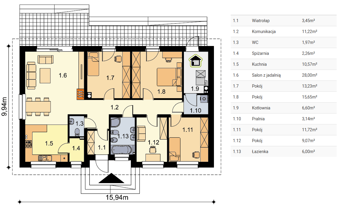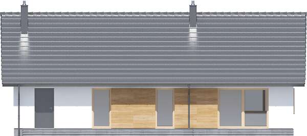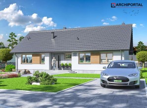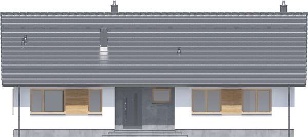 Duży nowoczesny dom parterowy z 4 sypialniami. Do środka dostajemy się przez ciekawy podcień wejściowy. Następnie z wiatrołapu i holu przechodzimy wprost do korytarza prowadzącego do salonu połączonego z otwartą kuchnią. W razie potrzeby kuchnię można oddzielić od pokoju dziennego ścianką działową. Nie zapomniano tutaj także o praktycznej spiżarni i centralnie usytuowanym kominku. Pozostała część domu to typowa strefa nocna z aż czterema ustawnymi pokojami, łazienką, osobną toaletą, pralnią i dużą kotłownią z bezpośrednim wyjściem na zewnątrz.