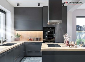 Strefa dzienna obejmuje przestronny, dobrze oświetlony salon, połączony z jadalnią i otwartą kuchnią, w której przewidziano odpowiednią ilość blatów do pracy, możliwość zaplanowania sprzętu w wysokiej zabudowie, miejsce na praktyczną wyspę na środku oraz sporą spiżarnię. Pozostała część domu to typowa strefa nocna z trzema dużymi i ustawnymi sypialniami, łazienką z miejscem na wannę i prysznic oraz przydatną pralnią i dodatkową toaletą.