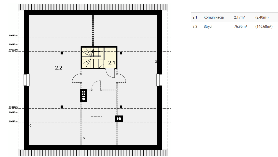 Prawdziwym atutem są jednak schody usytuowane w korytarzu, prowadzące bezpośrednio na poddasze. Dzięki dwuspadowej konstrukcji dachu jest tutaj dodatkowe 80m² powierzchni użytkowej, które w razie potrzeby można zaadaptować na kolejne pomieszczenia mieszkalne.
