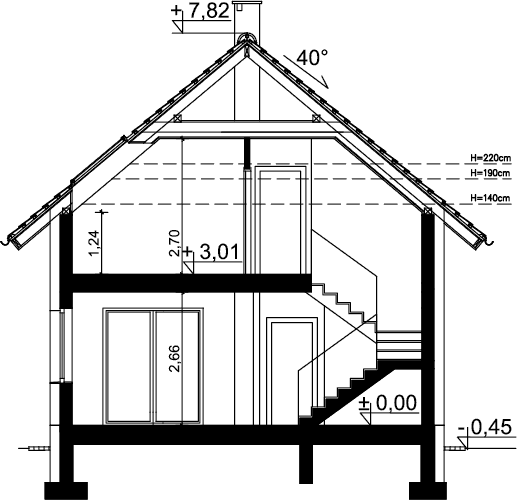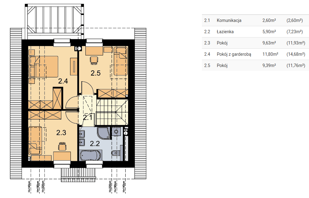 Na parterze zmieścił się salon wraz z otwartą kuchnią, w której zaplanowano sporo miejsca na ciąg praktycznych blatów roboczych. Zaprojektowano tutaj również: duży wiatrołap, toaletę, dodatkowy pokój oraz sporą kotłownię, w której przewidziano dwa rodzaje ogrzewania: GAZOWE oraz na PALIWO STAŁE (projekt zawiera schematy i rozwinięcia instalacji c.o. i elektrycznych, obydwu sposobów ogrzewania). Inwestor sam zadecyduje, które z nich wykorzysta w swoim domu. Poddasze to typowa strefa nocna. Do dyspozycji mieszkańców są tu 3 ustawne pokoje, w tym spora sypialnia rodziców z własną garderobą oraz łazienka, która bez trudu pomieści wannę i prysznic. Dzięki wysokiej ściance kolankowej maksymalnie wykorzystana została przestrzeń pod skosami. Elewację budynku można wykończyć zarówno w tradycyjnym, jak i nowoczesnym stylu. Przy projektowaniu domu Abel nie zapomnieliśmy o ekologii. Dokumentacja projektowa zawiera alternatywną wentylację mechaniczną, a dzięki zastosowanym materiałom cały budynek ma minimalny wpływ na środowisko naturalne i spełnia wszystkie rygorystyczne wymogi współczesnego projektowania.