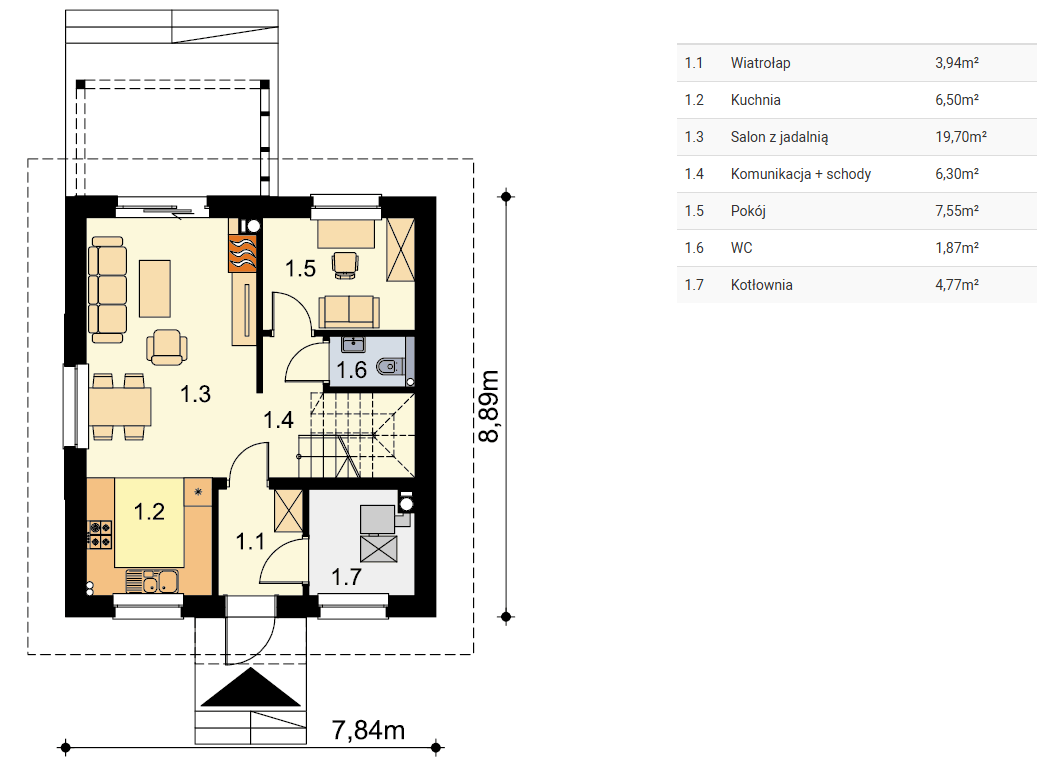 Atrakcyjny projekt domu jednorodzinnego z poddaszem użytkowym, którego powierzchnia zabudowy nie przekracza 70 m2. Prosta bryła i nieskomplikowany dach będą miały niewątpliwy wpływ na niskie koszty budowy oraz późniejszej eksploatacji, a dzięki funkcjonalnej organizacji wnętrza i efektywnie wykorzystanej przestrzeni dom ten posiada program użytkowy charakterystyczny dla dużo większych budynków. Doskonale sprawdzi się też w realizacjach na wąskich działkach.