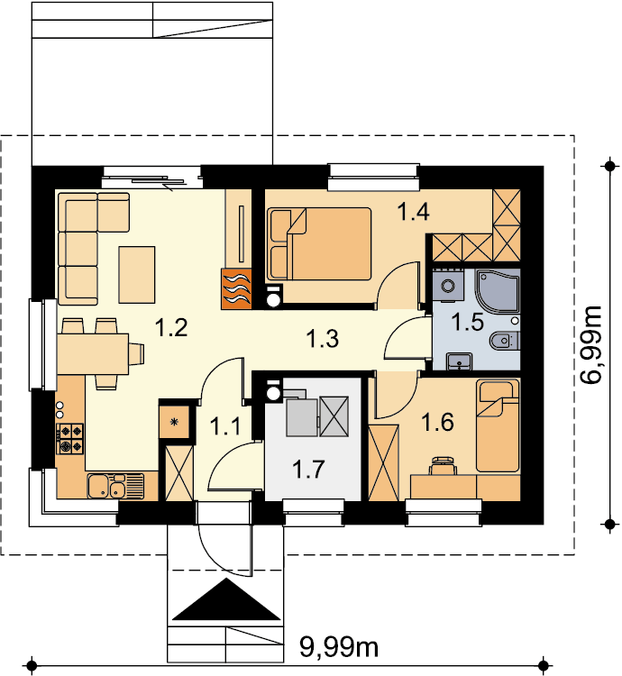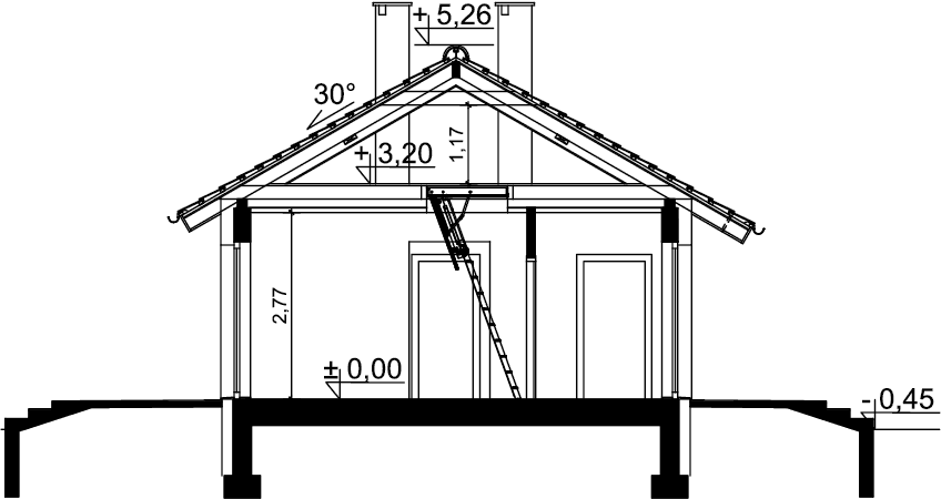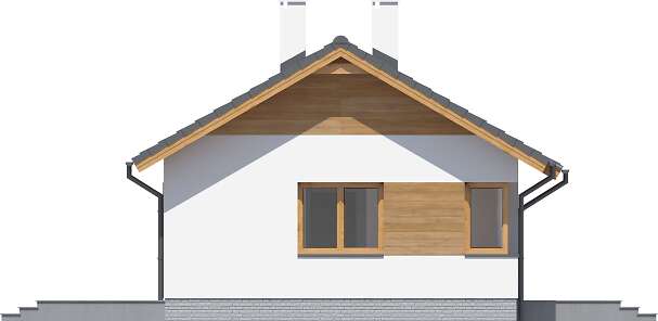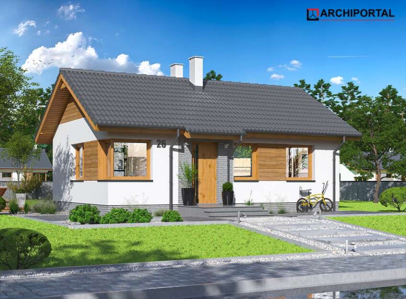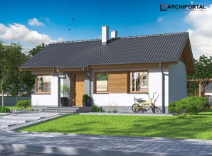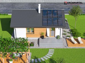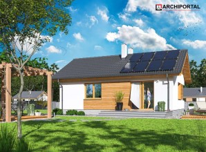 Całoroczny budynek parterowy z dwuspadowym dachem i powierzchnią zabudowy nie przekraczającą 70m². Jest to doskonała propozycja dla wszystkich tych, którzy marzą o własnym domu za rozsądne pieniądze. Dzięki funkcjonalnej organizacji wnętrza i optymalnie wykorzystanej przestrzeni w budynku zmieściły się salon z otwartą kuchnią, dwa pokoje, w tym jeden z garderobą, łazienka i kotłownia, w której zaprojektowano dwa rodzaje ogrzewania: GAZOWE oraz na PALIWO STAŁE (projekt zawiera schematy i rozwinięcia instalacji c.o. i elektrycznych, obydwu sposobów ogrzewania). Inwestor sam zadecyduje, które z nich wykorzysta w swoim domu. W przypadku zastosowania ogrzewania gazowego można zmniejszyć kotłownię, powiększając jeden z pokojów. Centralnie położony kominek w salonie może się natomiast przydać zimą, jako dodatkowe źródło ogrzewania. W pokoju dziennym znalazły się także schody opuszczane, prowadzące na niewielki stryszek, który może posłużyć za dodatkową przestrzeń do przechowywania. Nieskomplikowana bryła oraz prosta konstrukcja dachu i stropu wpłyną niewątpliwie na niskie koszty budowy oraz późniejszej eksploatacji. Elewację budynku można wykończyć zarówno w tradycyjnym, jak i nowoczesnym stylu. Przy projektowaniu domu Tiara Mini nie zapomnieliśmy o ekologii. Dokumentacja projektowa zawiera alternatywną wentylację mechaniczną, a dzięki zastosowanym materiałom cały budynek ma minimalny wpływ na środowisko naturalne i spełnia wszystkie rygorystyczne wymogi współczesnego projektowania.