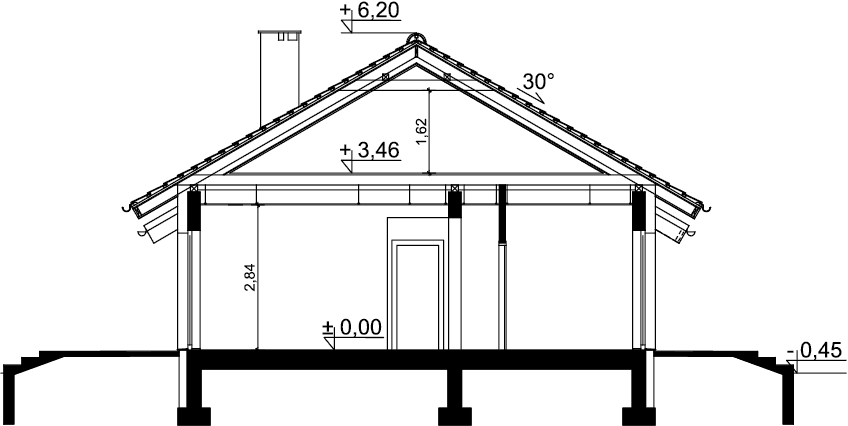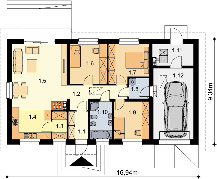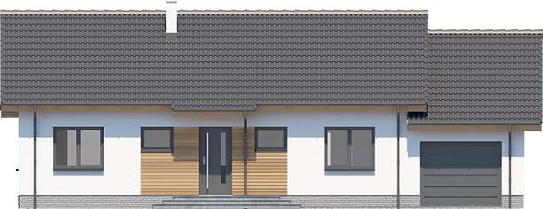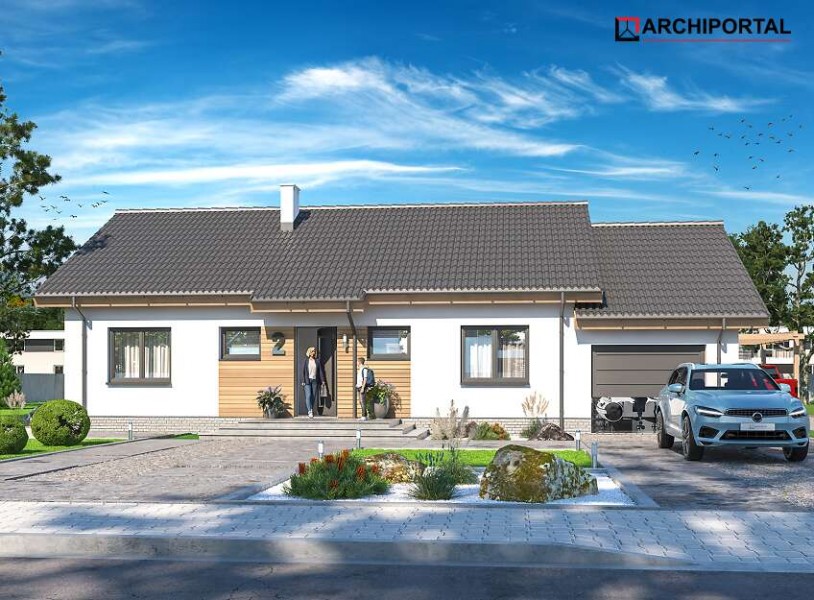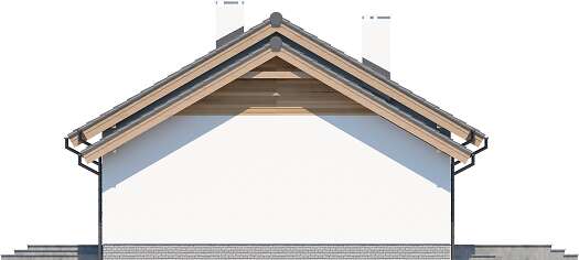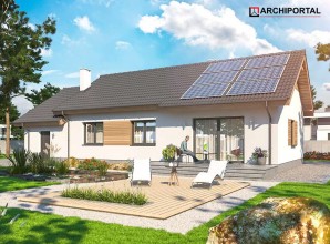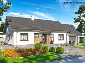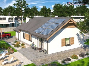 Ten niewielki dom parterowy doskonale nadaje się dla 3 - 4 osobowej rodziny. Jego zaletami są: funkcjonalność, prosta bryła budynku i niskie koszty budowy oraz późniejszej eksploatacji. Wnętrze domu zostało podzielone na trzy strefy: dzienną, nocną i gospodarczą. W ciągu dnia mieszkańcy mogą relaksować się w przestronnym, dobrze oświetlonym salonie, połączonym z otwartą kuchnią, w sąsiedztwie której znajduje się praktyczna spiżarnia. Centralne położenie kominka daje możliwość wykorzystania go, jako dodatkowego źródła ogrzewania zimą, co pozwala na zmniejszenie kosztów eksploatacji budynku. Strefa nocna to 3 ustawne pokoje oraz duża, jasna łazienka, w której przewidziano miejsce na wannę i prysznic. Dom posiada niewielki stryszek, na który prowadzą składane schody w korytarzu. Na jego końcu przewidziano pralnię przez którą dostajemy się wprost do jednostanowiskowego garażu. Zaraz za nim znalazła się spora kotłownia z wyjściem bezpośrednio na zewnątrz. W budynku zaprojektowano 2 rodzaje ogrzewania: GAZOWE oraz na PALIWO STAŁE. Dzięki takiemu zabiegowi, projektu nie trzeba przerabiać, inwestor sam decyduje, który rodzaj ogrzewania zastosuje w swoim domu - dokumentacja zawiera schematy i rozwinięcia instalacji c.o. i elektrycznych dla obydwu rozwiązań. Elewację budynku można wykończyć zarówno w sposób klasyczny jak i nowoczesny dzięki czemu dom wtopi się w otoczenie dużego miasta, jak i spokojnej wsi.