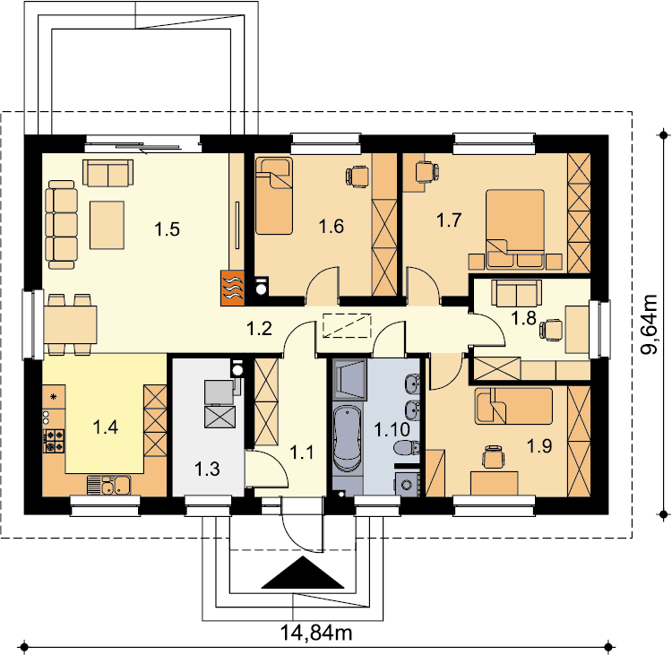 Tebe 4 to średniej wielkości dom parterowy z dwuspadowym dachem i bardzo dobrze przemyślanym układem wnętrza, które może służyć wieloosobowej rodzinie. Budynek ma prostą bryłę i konstrukcję dachu, dzięki czemu będzie tani w budowie i późniejszej eksploatacji. Jego elewację można wykończyć zarówno w nowoczesnym, jak i tradycyjnym stylu. Do wnętrza dostajemy się przez spory wiatrołap, w którym przewidziano miejsce na praktyczny ciąg szaf. Jest tutaj też wejście wprost do kotłowni. Zaprojektowano w niej dwa rodzaje ogrzewania: GAZOWE oraz na PALIWO STAŁE. Dzięki takiemu zabiegowi, projektu nie trzeba przerabiać, inwestor sam decyduje, który rodzaj ogrzewania zastosuje w swoim domu - dokumentacja zawiera schematy i rozwinięcia instalacji c.o. i elektrycznych dla obydwu rozwiązań.