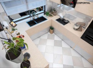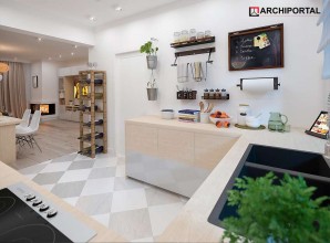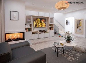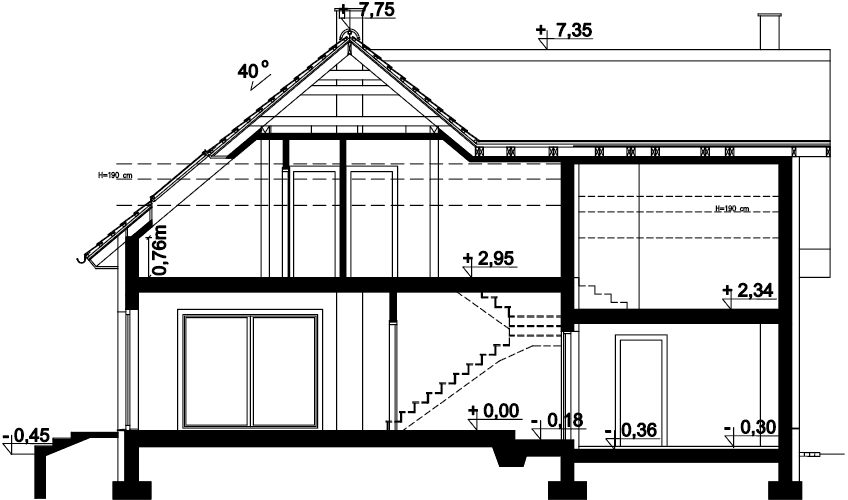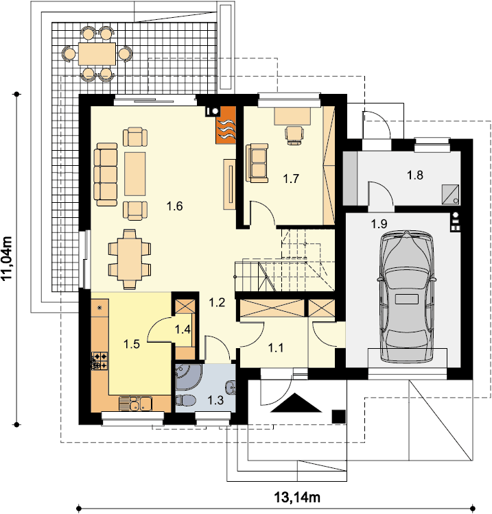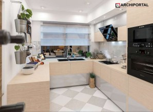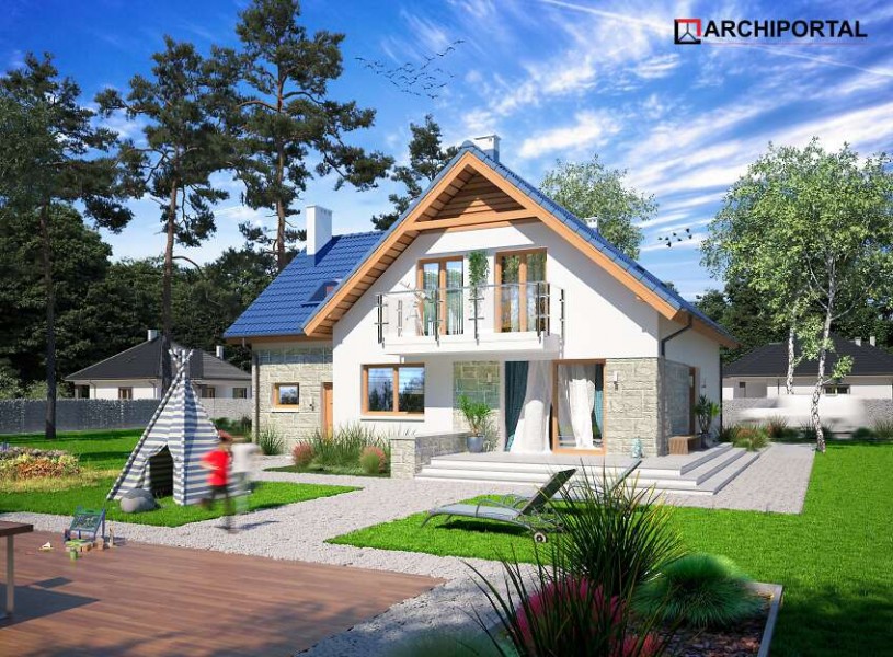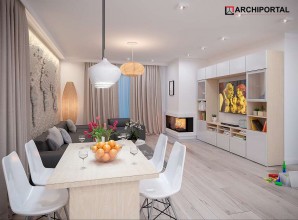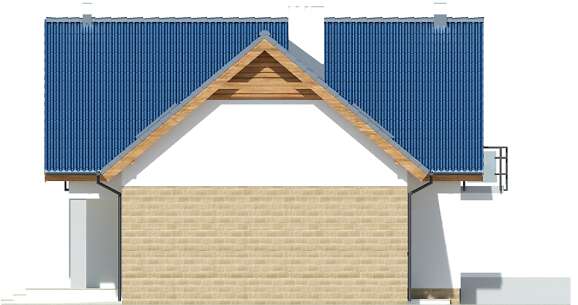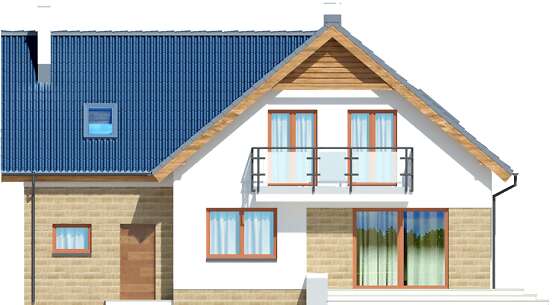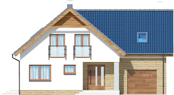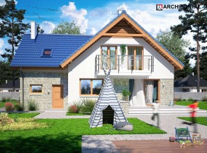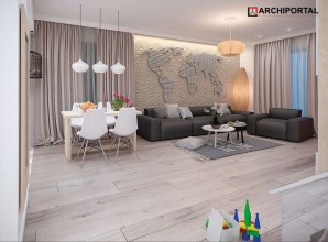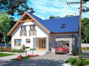 Do wnętrza domu dostajemy się przez gustowny podcień i sporych rozmiarów wiatrołap, z którego wejdziemy też do szerokiego, jednostanowiskowego garażu. Za garażem zaplanowano sporą kotłownię, w której zaprojektowano dwa rodzaje ogrzewania: GAZOWE oraz na PALIWO STAŁE-biomasę. Dzięki takiemu rozwiązaniu, projektu nie trzeba przerabiać, Inwestor sam decyduje, który rodzaj ogrzewania zastosuje w swoim domu - dokumentacja zawiera schematy i rozwinięcia instalacji c.o. i elektrycznych, obydwu sposobów ogrzewania. W korytarzu przy wiatrołapie znajduje się łazienka z kabiną prysznicową. W głębi budynku, za klatką schodową, umieszczono z kolei pokój – idealne miejsce na gabinet. Najbardziej reprezentacyjną część parteru zajmuje jasny, wygodny pokój dzienny z jadalnią oraz przylegającą doń kuchnią ze spiżarnią. Kuchnię w razie potrzeby można oddzielić od pozostałych pomieszczeń.