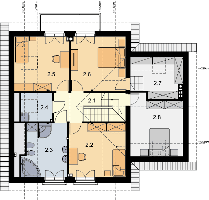 Poddasze to typowa strefa nocna, 3 ustawne pokoje, łazienka z miejscem na wannę i prysznic oraz praktyczna pralnia, którą ewentualnie można przekształcić w garderobę. Prawdziwym atutem projektu PUK 3 jest natomiast pomieszczenie nad garażem, ścianka kolankowa ma tu aż 140 cm wysokości, co gwarantuje wygodę korzystania z tej przestrzeni. Wstępnie powierzchnię tę podzielono na 2 pomieszczenia: garderobę dostępną z głównej sypialni, do której dostaniemy się po kilku stopniach oraz strych dostępny ze spocznika schodów, który można zamienić np. na dodatkowy pokój. Pomieszczenia te można oczywiście połączyć, tworząc jedno duże.