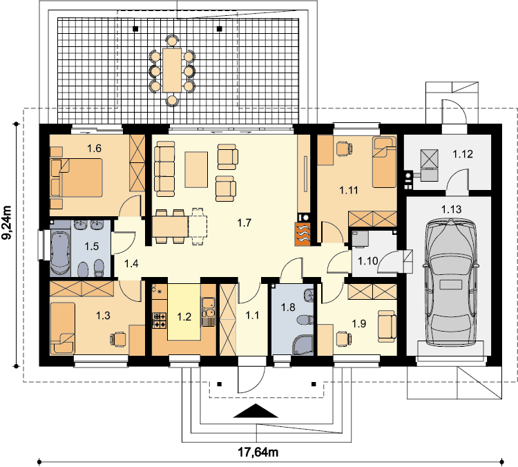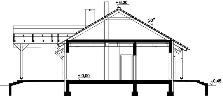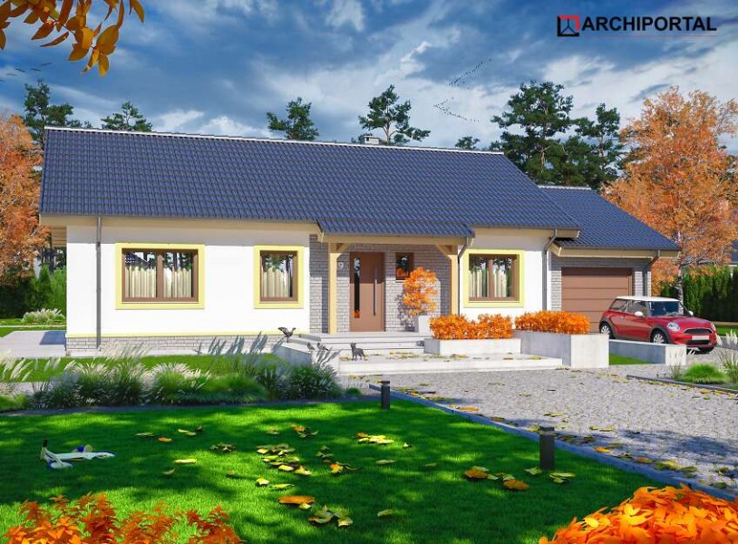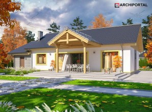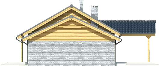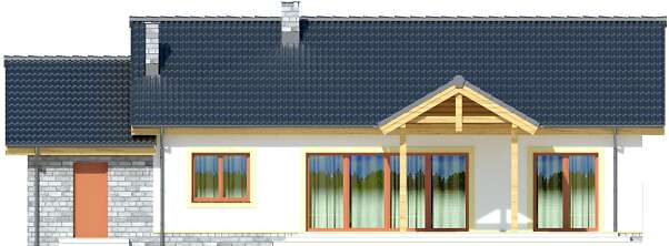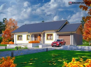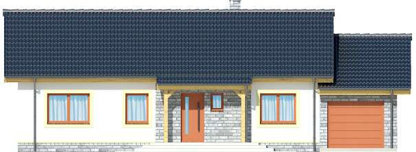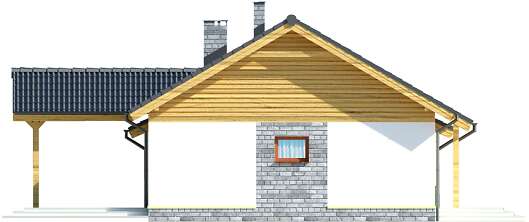Prosty i tani w budowie dom parterowy przykryty dwuspadowym dachem. W budynku znajdują się aż cztery pokoje poza salonem, z których jeden można przeznaczyć na przykład na gabinet, a resztę na sypialnie. Daje to również możliwość zamieszkania w domu większej rodzinie. Pokój dzienny jest duży i bardzo dobrze oświetlony przez szerokie okno wychodzące bezpośrednio do ogrodu. Na tarasie zaprojektowano natomiast praktyczne zadaszenie, pod którym zmieści się długi stół. Do dyspozycji mieszkańców jest ponadto: ustawna kuchnia, dwie łazienki oraz pralnia, przez którą dostaniemy się bezpośrednio do garażu. Za nim zaprojektowano sporą kotłownię z kotłem na paliwo stałe – biomasę. W budynku wykorzystano sprawdzone rozwiązania, w tym tani strop drewniany. Przestrzeń strychu jest duża i dostaniemy się na nią przez opuszczane schody składane.