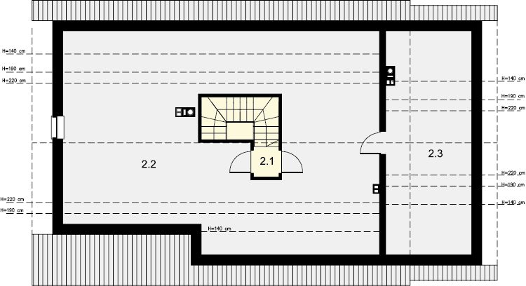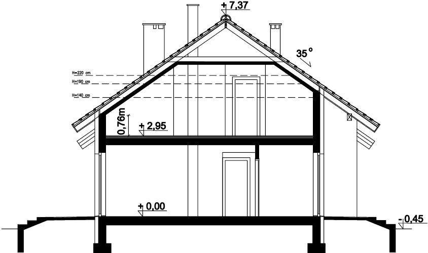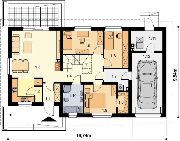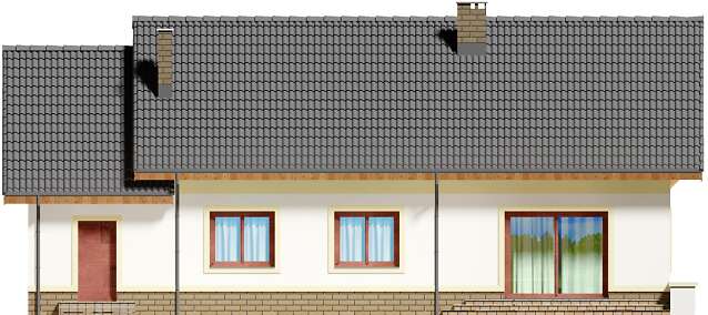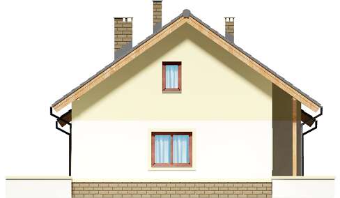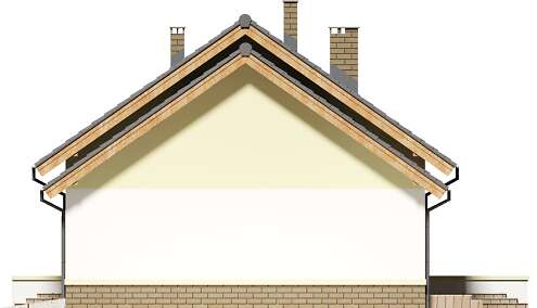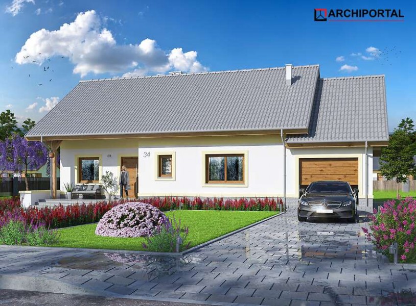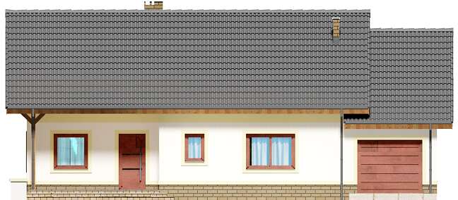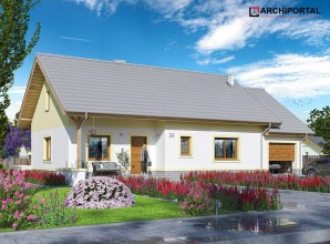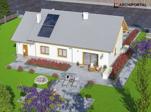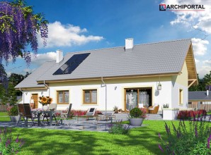 Mały, urokliwy dom parterowy z garażem i możliwością adaptacji poddasza. W budynku dużą uwagę poświęcono funkcjonalności wnętrz i maksymalnemu wykorzystaniu przestrzeni. Do dyspozycji mieszkańców są: duży, jasny salon, połączono z kuchnią, 3 ustawne pokoje, jeden z własną garderobą oraz przestronna łazienka z miejscem na wannę i prysznic. Do garażu przechodzimy przez praktyczne pomieszczenie gospodarcze, w którym wygospodarowano miejsce na pralkę. Za garażem znajduje się spora kotłownia, w której zaprojektowano dwa rodzaje ogrzewania: gazowe oraz na paliwo stałe – biomasę. Dokumentacja projektu zawiera rozwinięcia obydwu rodzajów instalacji, tak by to inwestor zdecydował, który z nich zastosuje w swoim domu, bez konieczności dodatkowych zmian na etapie adaptacji. W korytarzu domu zaprojektowano schody drewniane prowadzące na poddasze nieużytkowe, ich usytuowanie powoduje, że strych możemy zaadaptować na dodatkowe pomieszczenia mieszkalne, co jest dużym atutem budynku. Wysoka ścianka kolankowa poddasza sprawi natomiast, że pomieszczenia te będą bardzo wygodne w użytkowaniu. W budynku zaprojektowano strop Teriva. Dom ma tradycyjną, ponadczasową bryłę i zwraca uwagę ciekawym podcieniem wejściowym, jednocześnie jest prosty i tani w budowie, a także późniejszej eksploatacji. Zastosowano w nim tylko sprawdzone i trwałe rozwiązania.
