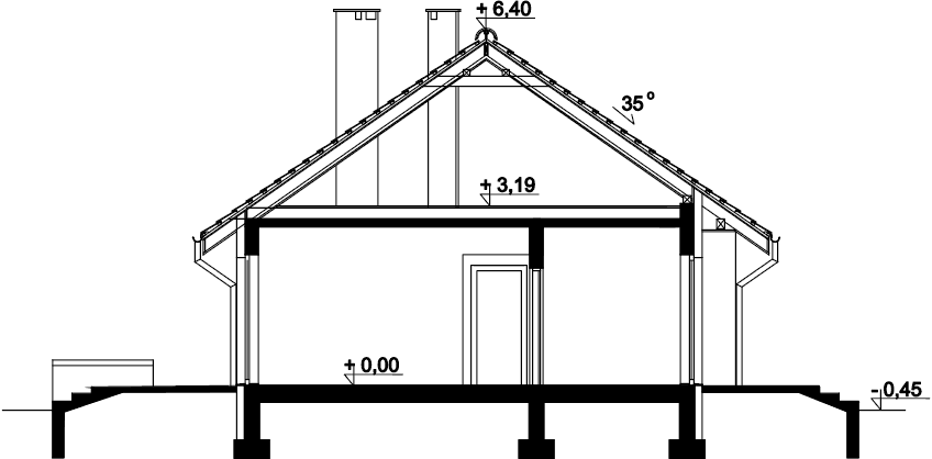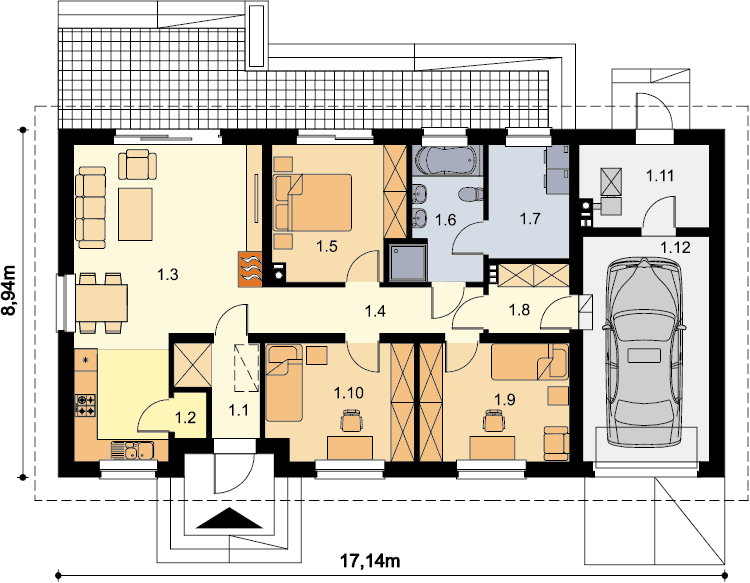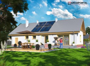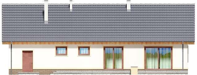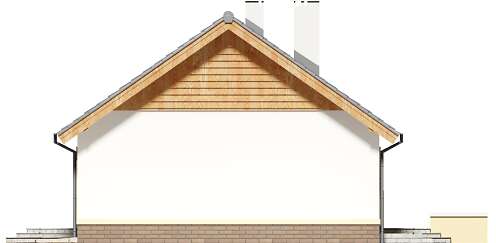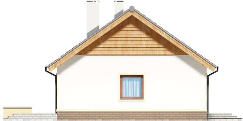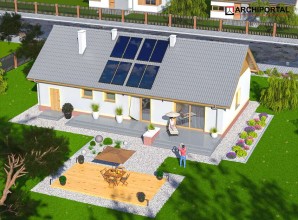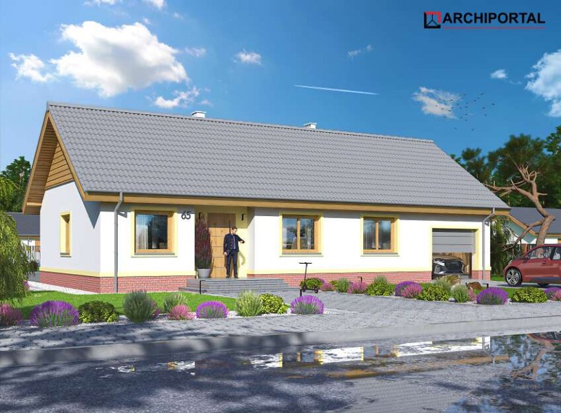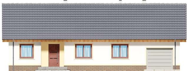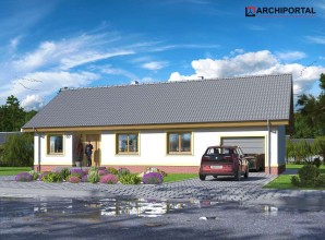 Mały, urokliwy dom parterowy z garażem przeznaczony dla 3-4 osobowej rodziny. Wnętrze budynku podzielono na 3 strefy. Strefa dzienna to przestronny, dobrze oświetlony salon, połączony z otwartą kuchnią, w sąsiedztwie której znajduje się praktyczna spiżarnia. Kuchnię, w razie potrzeby, można w łatwy sposób wydzielić, odgradzając ją ścianką od pokoju dziennego. Centralne usytuowania kominka ułatwi ogrzewanie domu zimą. Strefa nocna to 3 ustawne pokoje i łazienka, w której zmieści się wanna i prysznic, połączono ją z dużą i wygodną pralnią. W głównej sypialni przewidziano miejsce na ciąg praktycznych szaf przesuwnych. Posiada ona także wyjście na taras. W skład strefy gospodarczej wchodzi kotłownia znajdująca się za garażem, do którego dostaniemy się przez wygodną garderobę bezpośrednio z korytarza domu. W budynku zaprojektowano strop drewniany, ma to istotny wpływ na obniżenie kosztów budowy. Na strych dostaniemy się natomiast przy pomocy schodów składanych. W domu zaplanowano ogrzewanie na PALIWO STAŁE. Dom ma prostą bryłę i nieskomplikowany dach, dzięki czemu jest tani w budowie i późniejszej eksploatacji. Budynek zaprojektowano w oparciu o najnowsze przepisy prawa budowlanego, z dużą dbałością o jego wpływ na środowisko naturalne.