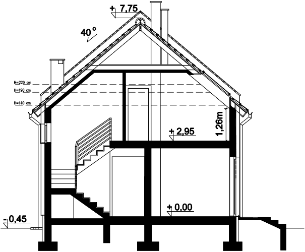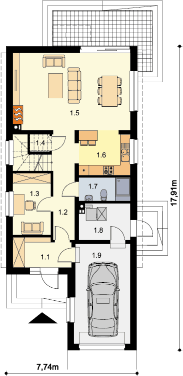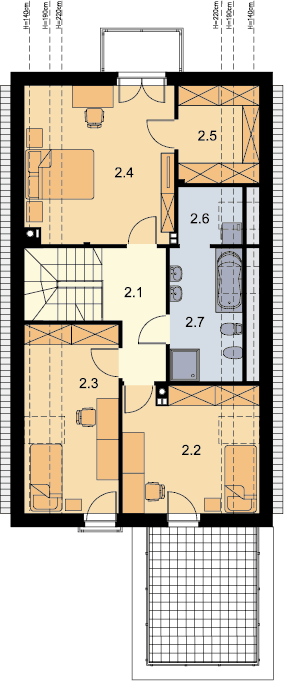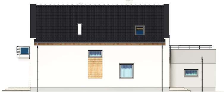 Projekt domu Slim przeznaczony jest na wąską działkę, której szerokość jest mniejsza niż 16 m. Do środka dostaniemy się przez wiatrołap, z którego jest dostęp także do jednostanowiskowego garażu. Układ wnętrza został tak pomyślany, że z tyłu budynku znajduje się duży, dobrze oświetlony salon, połączony z otwartą kuchnią. W ten sposób wykorzystano całą szerokość domu, zapewniając domownikom maksimum komfortu. Na parterze znajduje się ponadto przestronna łazienka, praktyczna spiżarnia pod schodami i co jest rzadkością w tego typu, wąskich budynkach, dodatkowy pokój, który może pełnić rolę gabinetu, biblioteczki lub pokoju gościnnego. Z garażu dostaniemy się do dużej kotłowni, w której zaprojektowano dwa rodzaje ogrzewania: GAZOWE oraz na PALIWO STAŁE. Od przyszłego inwestora zależeć będzie, które z nich wybierze. Poddasze domu to typowa strefa nocna, 3 ustawne sypialnie, jedna z własną, przestronną garderobą oraz duża łazienka połączona z pralnią. Największy pokój znajduje się od ogrodu i posiada własny balkon, z drugiego z pozostałych pokojów dostaniemy się bezpośrednio na taras nad garażem. Ścianka kolankowa na poddaszu to aż 126 cm, więc powierzchnia użytkowa pomieszczeń jest bardzo duża. Projekt ma nowoczesną bryłę i elewację, bez trudu jednak wkomponuje się w każdy rodzaj krajobrazu. Budynek zaprojektowano w oparciu o najnowsze przepisy prawa budowlanego, z dużą dbałością o jego wpływ na środowisko naturalne.