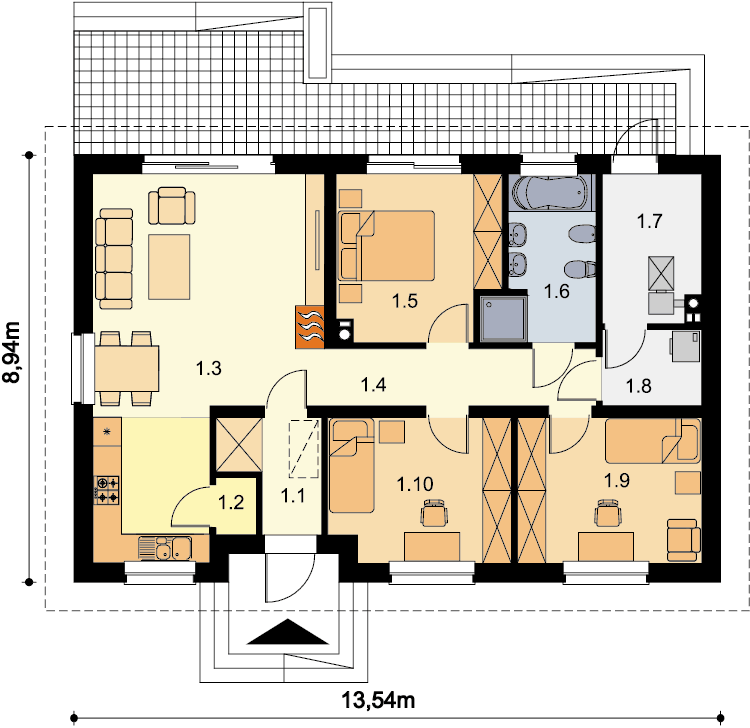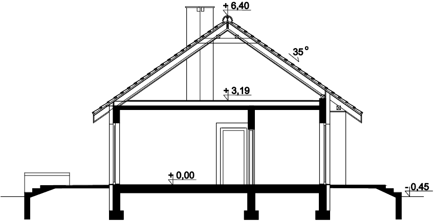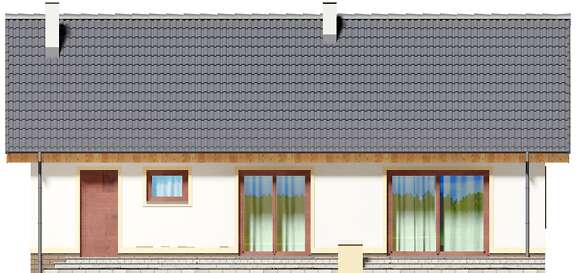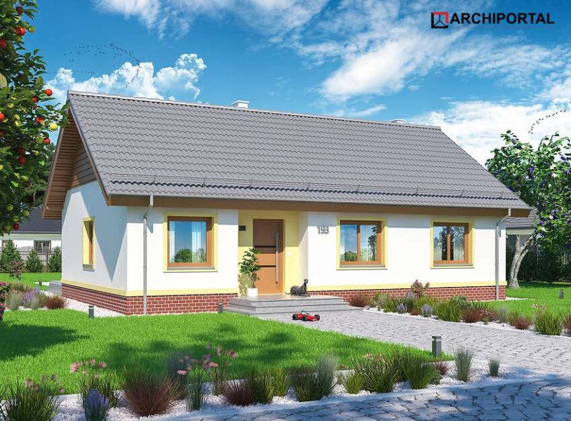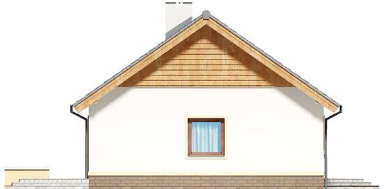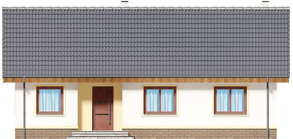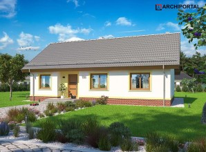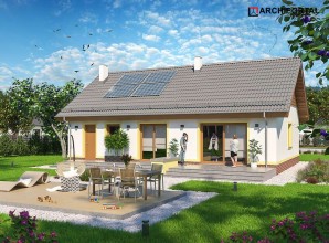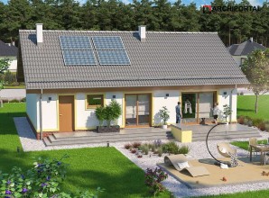 Mały, urokliwy dom parterowy przeznaczony dla 3-4 osobowej rodziny. Wnętrze budynku podzielono na 3 strefy. Strefa dzienna to przestronny, dobrze oświetlony salon, połączony z otwartą kuchnią, w sąsiedztwie której znajduje się praktyczna spiżarnia. Kuchnię, w razie potrzeby, można w łatwy sposób wydzielić, odgradzając ją ścianką od pokoju dziennego. Centralne usytuowania kominka ułatwi ogrzewanie domu zimą. Strefa nocna to 3 ustawne pokoje i łazienka, w której zmieści się wanna i prysznic. W głównej sypialni przewidziano miejsce na ciąg praktycznych szaf przesuwnych. Posiada ona także wyjście na taras. Strefę gospodarczą zaplanowano na krańcu budynku, składają się na nią: pralnia oraz duża kotłownia, z bezpośrednim wyjściem na zewnątrz. W korytarzu przewidziano schody składane, umożliwiające dostęp do strychu. W budynku zaprojektowano strop drewniany, ma to istotny wpływ na obniżenie kosztów budowy. W domu zaplanowano także ogrzewanie na PALIWO STAŁE. Dom ma prostą bryłę i nieskomplikowany dach, dzięki czemu jest tani w budowie i późniejszej eksploatacji. Budynek zaprojektowano w oparciu o najnowsze przepisy prawa budowlanego, z dużą dbałością o jego wpływ na środowisko naturalne.