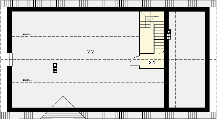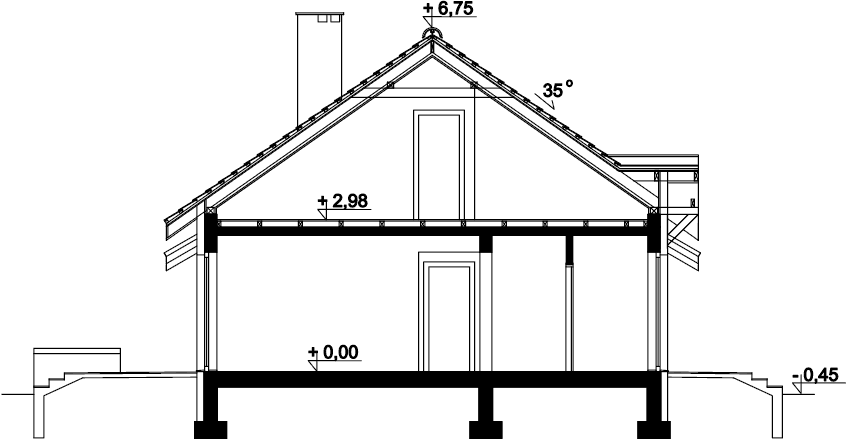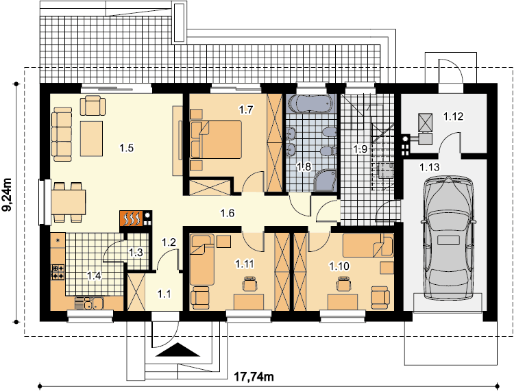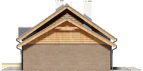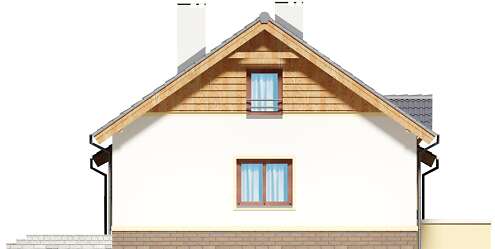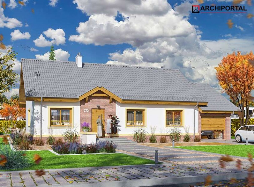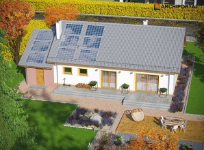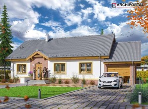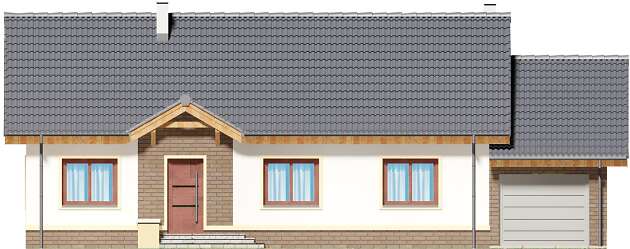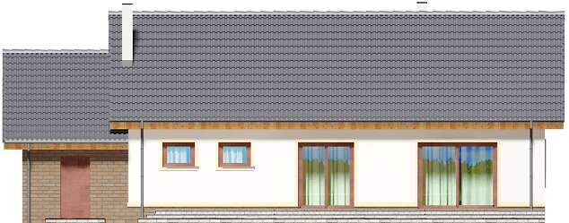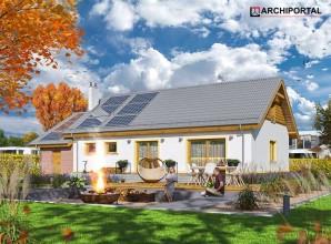 Dom parterowy przeznaczony dla 3-4 osobowej rodziny. Wnętrze budynku podzielono na 3 strefy. Strefa dzienna to przestronny, dobrze oświetlony salon, połączony z otwartą kuchnią, w sąsiedztwie której znajduje się praktyczna spiżarnia. Kuchnię, w razie potrzeby, można w łatwy sposób wydzielić, odgradzając ją ścianką od pokoju dziennego. Centralne usytuowania kominka ułatwi ogrzewanie domu zimą. Strefa nocna to 3 ustawne pokoje i łazienka, w której zmieści się wanna i prysznic. W głównej sypialni przewidziano miejsce na ciąg praktycznych szaf przesuwnych. Posiada ona także wyjście na taras. Strefę gospodarczą zaplanowano na krańcu budynku, składają się na nią: duże pomieszczenie gospodarcze z przeznaczeniem np. na pralnię oraz kotłownia znajdująca się za garażem. Wyrównanie ścian garażu i domu pozwoliło zoptymalizować wielkość kotłowni, w której zaprojektowano dwa rodzaje ogrzewania: GAZOWE oraz na PALIWO STAŁE. Od przyszłego inwestora zależy, które z nich wykorzysta. Dodatkowo w pomieszczeniu gospodarczym, przez które dostajemy się z garażu do budynku, zaprojektowano schody drewniane prowadzące na poddasze. Takie umiejscowienie schodów sprawia, że otrzymujemy naprawdę sporych rozmiarów powierzchnię na poddaszu. Tę wielką przestrzeń strychu można zaadaptować na studio, pracownię, pokój hobby lub dodatkowe pomieszczenia mieszkalne. Dom ma prostą bryłę i nieskomplikowany dach, dzięki czemu jest tani w budowie i późniejszej eksploatacji. Budynek zaprojektowano w oparciu o najnowsze przepisy prawa budowlanego, z dużą dbałością o jego wpływ na środowisko naturalne.