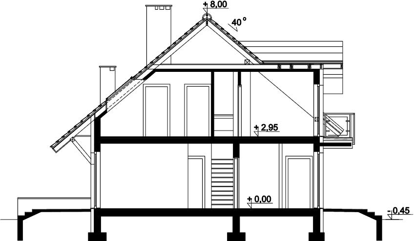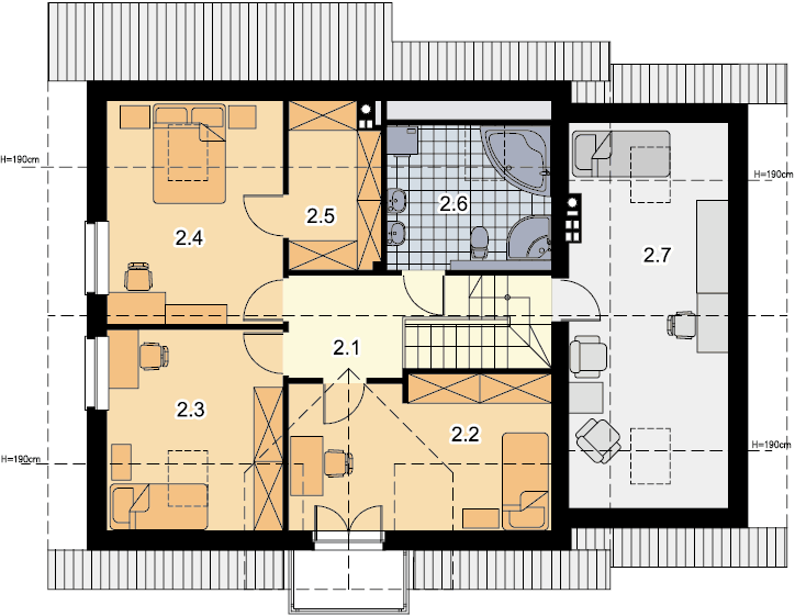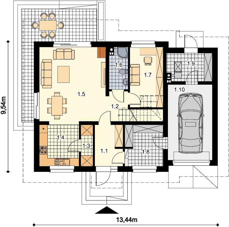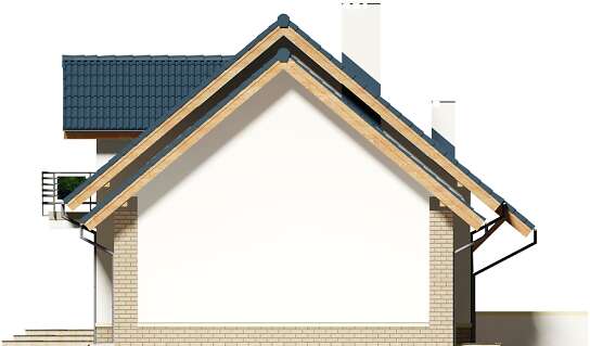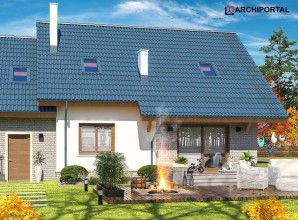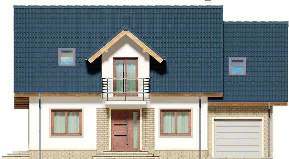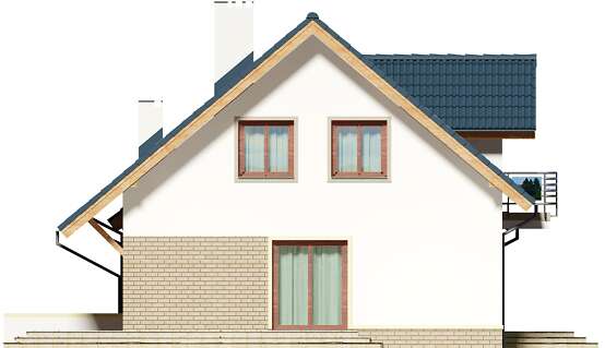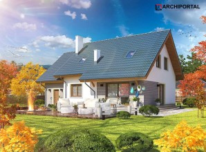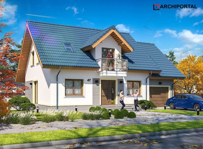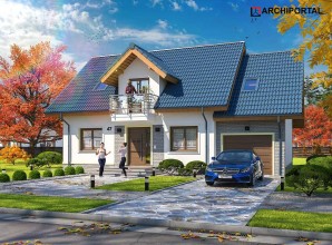 Klasyczny dom z użytkowym poddaszem i dostawionym garażem. Prosta bryła, sprawdzone rozwiązania konstrukcyjne i jednocześnie przejrzysty, niezwykle przemyślany układ wnętrz, to bez wątpienia zalety tego budynku. Do środka dostajemy się przez dużych rozmiarów wiatrołap, w którym wygospodarowano miejsce na praktyczne szafy przesuwne. W ciągu dnia domownicy mogą relaksować się w dużym, dobrze oświetlonym salonie, z którego na zewnątrz prowadzą dwa wyjścia – bezpośrednio na ogród i drugie, zaraz przy jadalni. Takie rozwiązanie sprawia, że dom nadaje się na działkę z wjazdem zarówno od północy, jak również od południa. Pokój dzienny połączono z kuchnią, którą w razie potrzeby można oddzielić ścianką działową. Nie zapomniano także o dużej, praktycznej spiżarni. Na parterze znalazł się jeszcze jeden pokój, który można przeznaczyć np. na gabinet oraz duża łazienka z prysznicem. Do garażu dostajemy się bezpośrednio z wiatrołapu przez dużych rozmiarów pomieszczenie gospodarcze, które może pełnić rolę garderoby, pralni lub składu akcesoriów ogrodowych. Zaraz za garażem znalazła się kotłownia z bezpośrednim wyjściem na ogród. Jest ona na tyle duża, że bez trudu pomieści piec na ekogroszek. W budynku zaprojektowano dwa rodzaje ogrzewania: GAZOWE oraz na PALIWO STAŁE. Inwestor zadecyduje, które z nich wykorzysta. Na piętrze znajdują się trzy ustawne pokoje i duża łazienka z miejscem na wannę i prysznic. Główna sypialnia została połączona ze sporą garderobą, ze spocznika schodów dostaniemy się natomiast do pomieszczenia nad garażem, które może pełnić rolę strychu, miejsca zabaw lub po prostu dodatkowego pokoju. Dom jest prosty i tani w budowie, jego elewację można wykończyć zarówno w nowoczesny jak i klasyczny sposób. Budynek zaprojektowano w oparciu o najnowsze przepisy prawa budowlanego, z dużą dbałością o jego wpływ na środowisko naturalne.