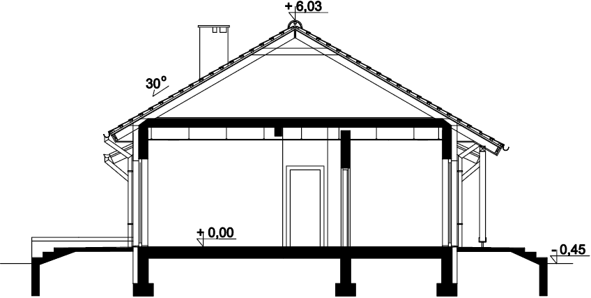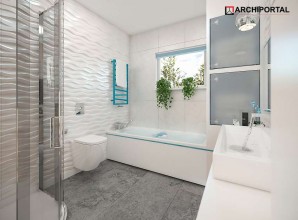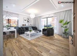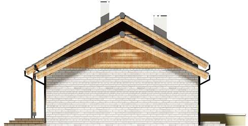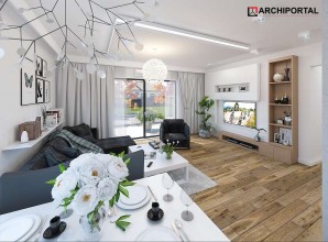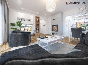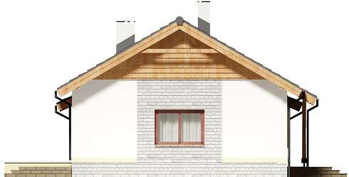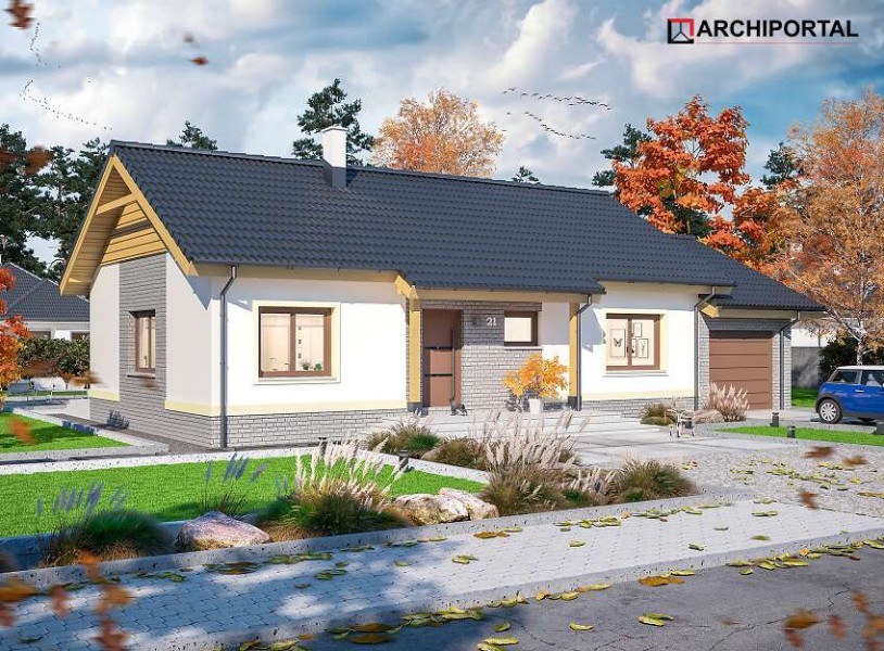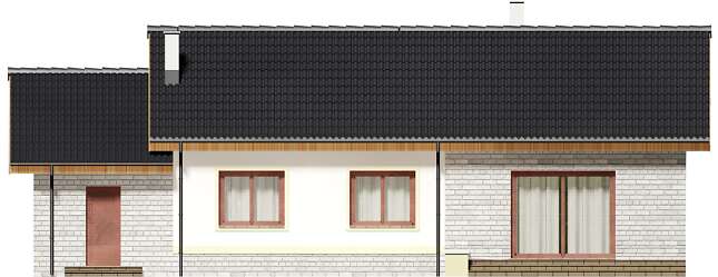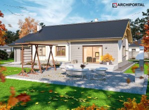 Prosty i funkcjonalny dom parterowy przeznaczony dla 3-4 osobowej rodziny. Do środka dostaniemy się przez dużych rozmiarów wiatrołap, w którym przewidziano miejsce na praktyczne szafy przesuwne. W ciągu dnia domownicy mogą relaksować się w dużym, dobrze oświetlonym salonie połączonym z otwartą kuchnią, w sąsiedztwie której znajduje się pojemna spiżarnia. W razie potrzeby kuchnię można oddzielić od pokoju dziennego ścianką działową. Centralnie umieszczony kominek pomoże w ogrzewaniu domu zimą. Strefa nocna to 3 ustawne pokoje oraz duża łazienka z miejscem na wannę, prysznica, a także pralkę. Bezpośrednio z wiatrołapu dostaniemy się do garażu za którym znajduje się kotłownia. Jest ona na tyle pojemna, że w budynku zaprojektowano piec i ogrzewanie na PALIWO STAŁE. Dom ma nieskomplikowaną bryłę i prosty dach, przez co jest łatwy i tani w budowie, jednocześnie oferując domownikom maksimum komfortu i funkcjonalności. Budynek zaprojektowano w oparciu o najnowsze przepisy prawa budowlanego, z dużą dbałością o jego wpływ na środowisko naturalne.