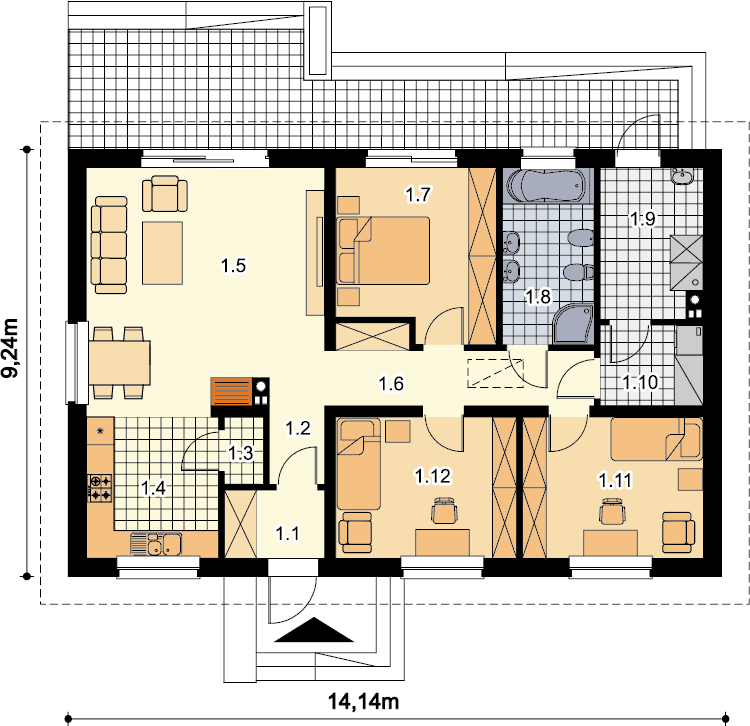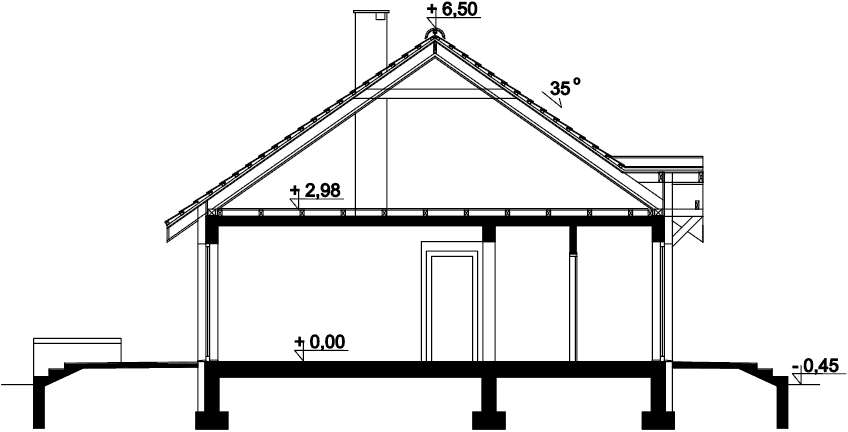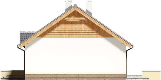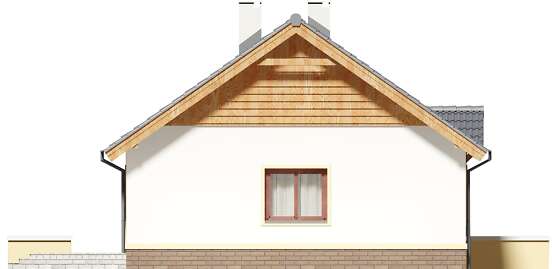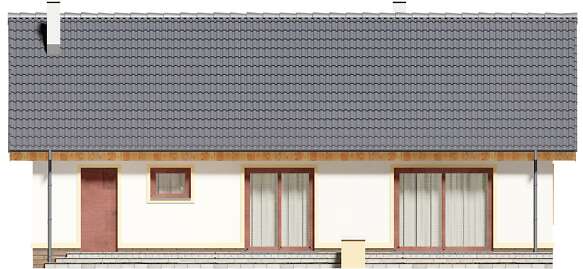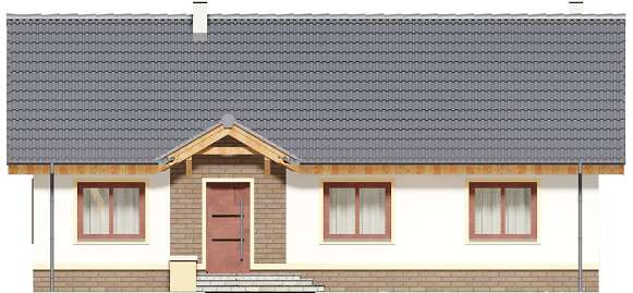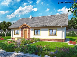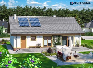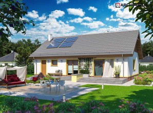 Dom parterowy przeznaczony dla 3-4 osobowej rodziny. Wnętrze budynku podzielono na 3 strefy. Strefa dzienna to przestronny, dobrze oświetlony salon, połączony z otwartą kuchnią, w sąsiedztwie której znajduje się praktyczna spiżarnia. Kuchnię, w razie potrzeby, można w łatwy sposób wydzielić, odgradzając ją ścianką od pokoju dziennego. Centralne usytuowania kominka ułatwi ogrzewanie domu zimą. Strefa nocna to 3 ustawne pokoje i łazienka, w której zmieści się wanna i prysznic. W głównej sypialni przewidziano miejsce na ciąg praktycznych szaf przesuwnych. Posiada ona także wyjście na taras. Strefę gospodarczą zaplanowano na krańcu budynku, składają się na nią: pralnia oraz duża kotłownia, z bezpośrednim wyjściem na zewnątrz. Pomieszczenia te mogą być połączone, tworząc jedno duże. W korytarzu przewidziano schody składane, umożliwiające dostęp na sporych rozmiarów strych. W domu zaprojektowano dwa rodzaje ogrzewania: GAZOWE oraz na PALIWO STAŁE. Od przyszłego inwestora zależy, które z nich wykorzysta. Dom ma prostą bryłę i nieskomplikowany dach, dzięki czemu jest tani w budowie i późniejszej eksploatacji. Budynek zaprojektowano w oparciu o najnowsze przepisy prawa budowlanego, z dużą dbałością o jego wpływ na środowisko naturalne.