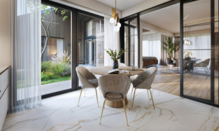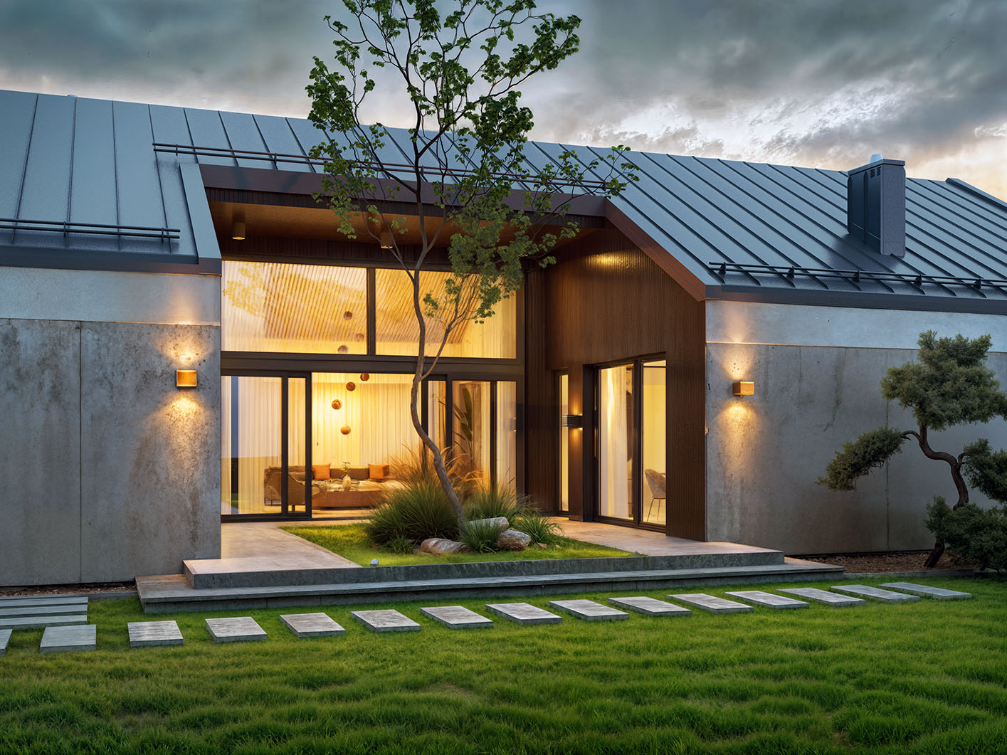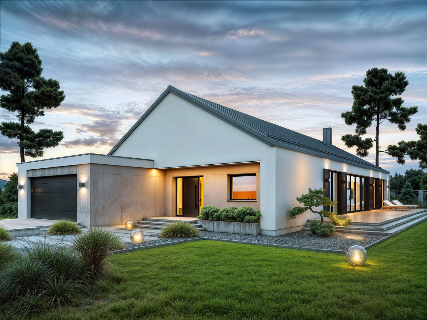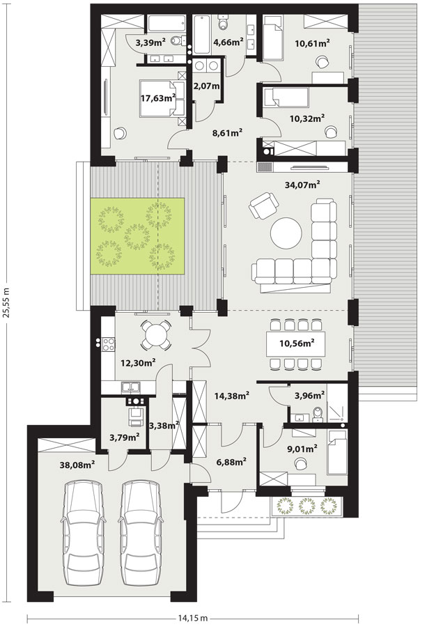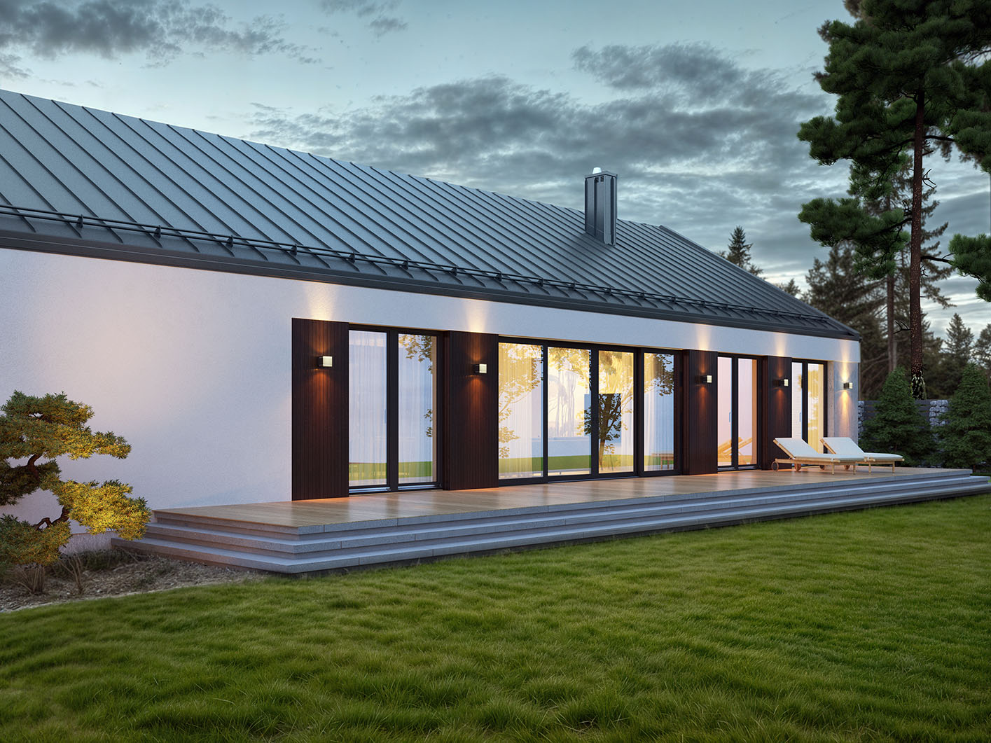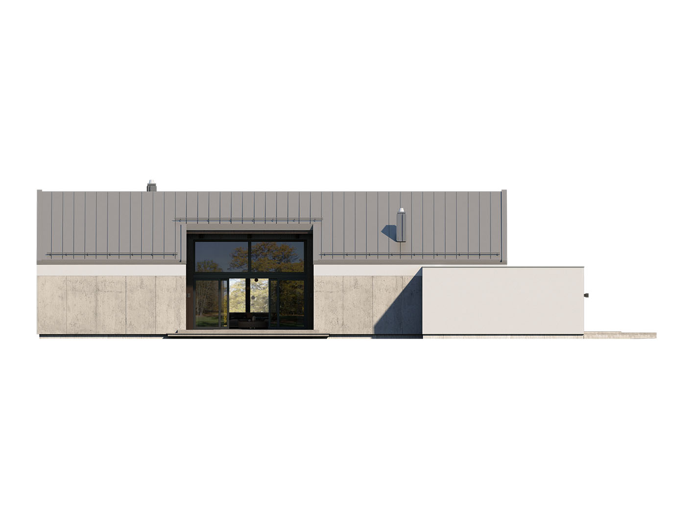 Asti 2 to parterowy dom jednorodzinny w stylu nowoczesnej stodoły o bardzo ciekawej architekturze. Jego centralnym punktem jest całkowicie przeszklona część dzienna wzbogacona wewnętrznym atrium, gdzie wnętrze domu przenika się z zewnętrznym środowiskiem i zatraca się w zieleni krajobrazu. Ta centralna część domu rozbija prostą bryłę na rzucie prostokąta przykrytego dwuspadowym dachem i równocześnie swoją otwartością stanowi kontrast do reszty bryły domu. Przestrzeń dzienna nie tylko pozwala na szereg aranżacji wnętrza ale umożliwia także na przenikanie poprzez przeszklenia i tarasy, otaczającej przyrody. Mimo tak ciekawej części dziennej dom charakteryzuje się prostym, funkcjonalnym układem pomieszczeń, który swoim programem zapewnia optymalny komfort 4-osobowej rodzinie. Od frontu budynku przewidziano część gospodarczą domu – przestronny wiatrołap i hol, kotłownię, łazienkę, spiżarnię, dwustanowiskowy garaż oraz gabinet. W strefie nocnej po drugiej stronie budynku zaprojektowano dwie sypialnie dzieci, łazienkę, pralnię oraz sypialnię rodziców z własną łazienką i garderobą. Ciekawym aspektem domu jest to, że dziedziniec nie jest dostępny tylko z salonu ale także z głównej sypialni oraz kuchni. W domu Asti 2 idealnie połączono prostą bryłę z przyciągającym uwagę ciekawym dziedzińcem i otwarciem w części dziennej. Może się to spodobać zarówno inwestorom poszukującym domu bardziej klasycznego jak i tym otwartym na współczesne spojrzenie na architekturę.