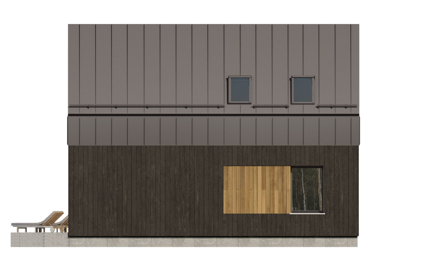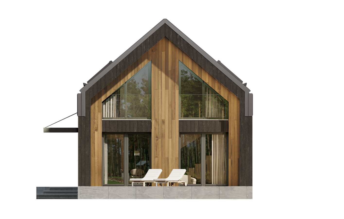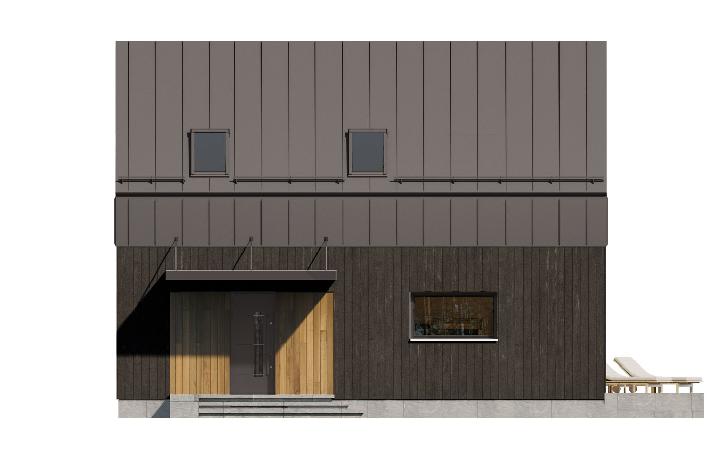 Zuza drewniana to projekt niedużego domu parterowego z użytkowym poddaszem, który wpisuje się w nurt nowoczesnej architektury. Pomimo niewielkich rozmiarów projekt ten zapewnia pełen komfort mieszkania nawet 4-osobowej rodzinie. To niewielki dom parterowy o idealnie rozplanowanym układzie funkcjonalnym i nowoczesnym wyglądzie. Zuza drewniana to projekt domu, który posiada powierzchnię zabudowy do 70 m2. Prosta, minimalistyczna bryła na rzucie prostokąta, dwuspadowy, bezokapowy dach oraz powierzchnia zabudowy nie przekraczająca 70m2 to gwarancja niewielkich kosztów budowy. W kształtowaniu nowoczesnego wyglądu domu uwagę przykuwa blacha na rąbek w kolorze antracytowym zestawiona z ciepłym naturalnym i ciemnym drewnem. Duże przeszklenia pozwalają na wprowadzenie do wnętrza dużych ilości naturalnego światła, co nie tylko sprawia, że pomieszczenia są jaśniejsze, ale także umożliwia cieszenie się widokiem otaczającego krajobrazu. Pomimo ograniczonej powierzchni użytkowej, układ funkcjonalny został starannie rozplanowany. Parter stanowi strefę dzienną z otwartą przestrzenią salonu, jadalni i kuchni. Dodatkowy pokój na parterze może pełnić różne funkcje, zależnie od potrzeb mieszkańców. Na parterze przewidziano również łazienkę oraz pomieszczenie gospodarcze, w którym zaprojektowano pompę ciepła. Na poddaszu zaprojektowano trzy funkcjonalne sypialnie, łazienkę oraz pralnię. Optymalne wykorzystanie przestrzeni na poddaszu umożliwia komfortowe warunki dla mieszkańców. Dom o takich gabarytach to oczywiście niższe koszty zarówno w fazie budowy, jak i w trakcie późniejszej eksploatacji. Mniejsza powierzchnia zabudowy oznacza także możliwość zakupu mniejszej działki, co może wpływać na korzystniejszy wybór lokalizacji. Projekt domu Zuza drewniana to doskonałe połączenie nowoczesnego designu, funkcjonalności oraz zrównoważonego podejścia do zagadnień budowlanych, co sprawia, że stanowi on atrakcyjną opcję dla tych, którzy cenią sobie komfort życia w mniejszych, nowoczesnych domach.