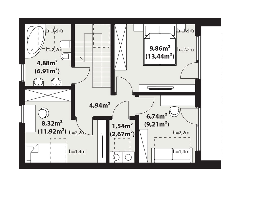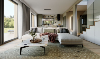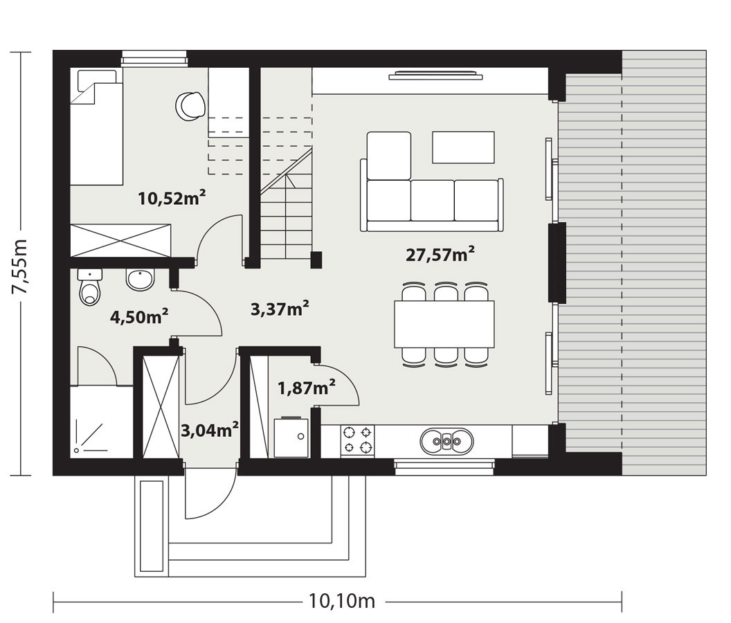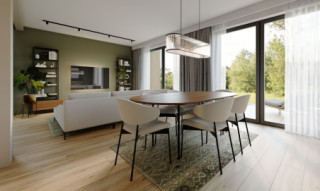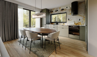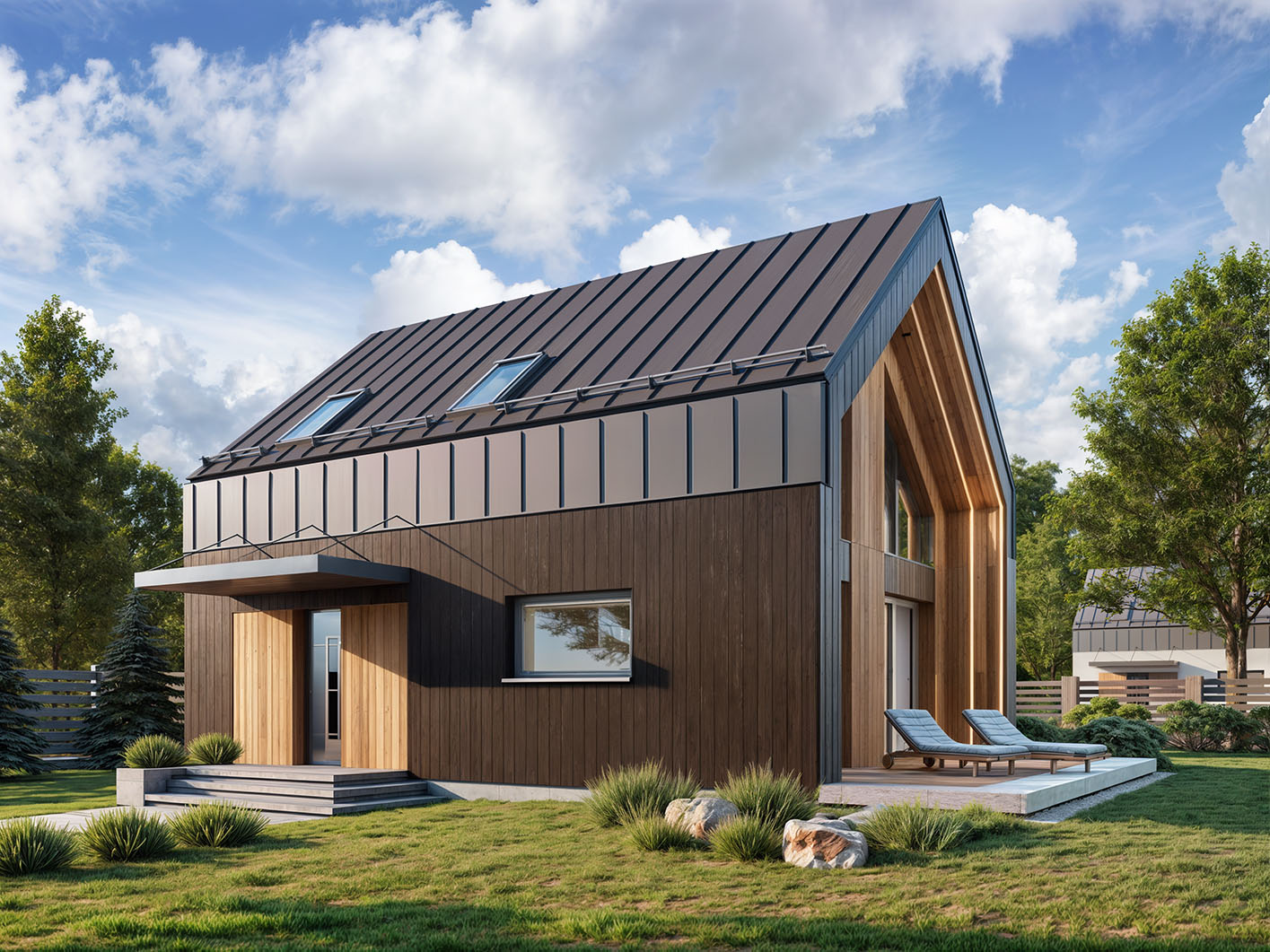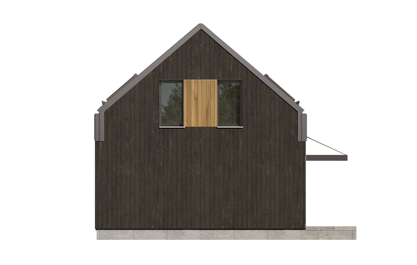Zuza drewniana to projekt niedużego domu parterowego z użytkowym poddaszem, który wpisuje się w nurt nowoczesnej architektury. Pomimo niewielkich rozmiarów projekt ten zapewnia pełen komfort mieszkania nawet 4-osobowej rodzinie. To niewielki dom parterowy o idealnie rozplanowanym układzie funkcjonalnym i nowoczesnym wyglądzie. Zuza drewniana to projekt domu, który posiada powierzchnię zabudowy do 70 m2. Prosta, minimalistyczna bryła na rzucie prostokąta, dwuspadowy, bezokapowy dach oraz powierzchnia zabudowy nie przekraczająca 70m2 to gwarancja niewielkich kosztów budowy. W kształtowaniu nowoczesnego wyglądu domu uwagę przykuwa blacha na rąbek w kolorze antracytowym zestawiona z ciepłym naturalnym i ciemnym drewnem. Duże przeszklenia pozwalają na wprowadzenie do wnętrza dużych ilości naturalnego światła, co nie tylko sprawia, że pomieszczenia są jaśniejsze, ale także umożliwia cieszenie się widokiem otaczającego krajobrazu. Pomimo ograniczonej powierzchni użytkowej, układ funkcjonalny został starannie rozplanowany. Parter stanowi strefę dzienną z otwartą przestrzenią salonu, jadalni i kuchni. Dodatkowy pokój na parterze może pełnić różne funkcje, zależnie od potrzeb mieszkańców. Na parterze przewidziano również łazienkę oraz pomieszczenie gospodarcze, w którym zaprojektowano pompę ciepła. Na poddaszu zaprojektowano trzy funkcjonalne sypialnie, łazienkę oraz pralnię. Optymalne wykorzystanie przestrzeni na poddaszu umożliwia komfortowe warunki dla mieszkańców. Dom o takich gabarytach to oczywiście niższe koszty zarówno w fazie budowy, jak i w trakcie późniejszej eksploatacji. Mniejsza powierzchnia zabudowy oznacza także możliwość zakupu mniejszej działki, co może wpływać na korzystniejszy wybór lokalizacji. Projekt domu Zuza drewniana to doskonałe połączenie nowoczesnego designu, funkcjonalności oraz zrównoważonego podejścia do zagadnień budowlanych, co sprawia, że stanowi on atrakcyjną opcję dla tych, którzy cenią sobie komfort życia w mniejszych, nowoczesnych domach.