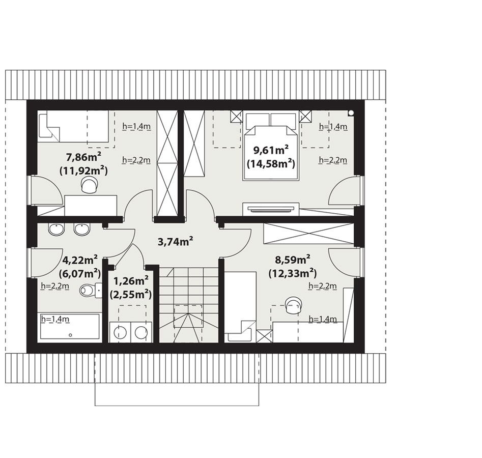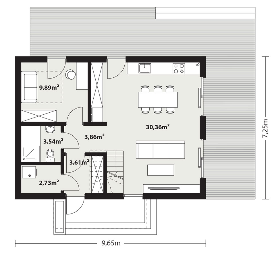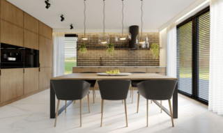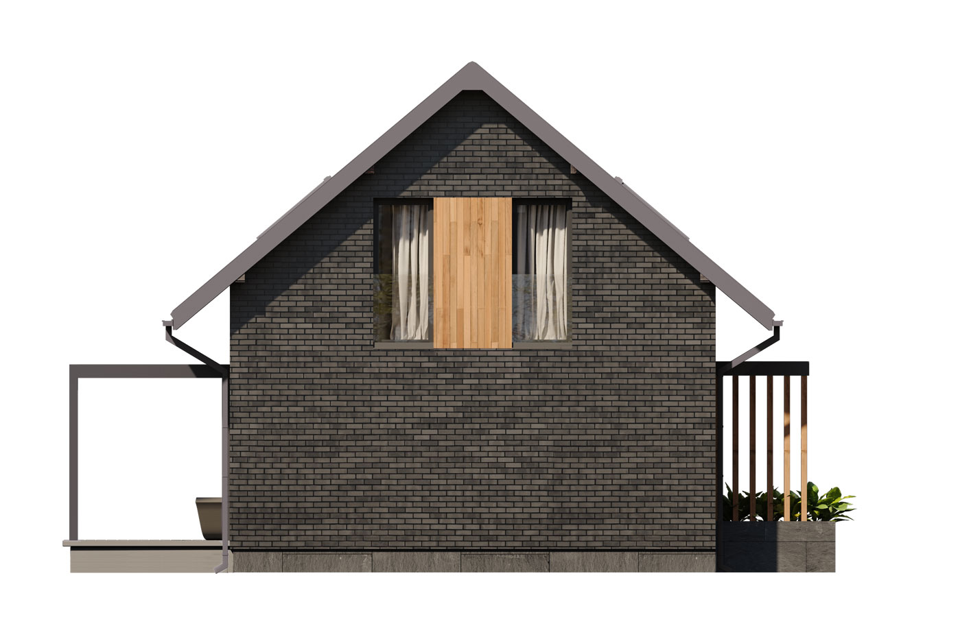 Helen 2 drewniana to projekt domu parterowego z użytkowym poddaszem, który wpisuje się w nurt nowoczesnej architektury. Zaprojektowany w technologii szkieletu drewnianego. Pomimo niewielkich rozmiarów projekt ten zapewni pełen komfort mieszkania nawet 4-osobowej rodzinie. To niewielki dom parterowy o idealnie rozplanowanym układzie funkcjonalnym i nowoczesnym wyglądzie. Minimalistyczna bryła, dwuspadowy dach oraz powierzchnia użytkowa nie przekraczająca 90 m2 to gwarancja niewielkich kosztów budowy. To projekt nie tylko tani i łatwy w budowie, ale również niezwykle funkcjonalny. Bryła budynku jest na rzucie prostokąta, co pozwala na optymalne wykorzystanie przestrzeni wewnątrz domu, co jest szczególnie ważne w przypadku niewielkich działek. Dom wykończono w nowoczesnym stylu. Uwagę przykuwa blacha na rąbek w kolorze antracytowym oraz ciemna płytka elewacyjna i stolarka, które zestawiono z panelami w kolorze naturalnego drewna. Zastosowane materiały nadają nieco surowego ale również oryginalnego charakteru. Duże, przeszklenia pozwalają na wprowadzenie do wnętrza dużych ilości naturalnego światła, co nie tylko sprawia, że pomieszczenia są jaśniejsze, ale także umożliwia cieszenie się widokiem otaczającego krajobrazu. Pomimo ograniczonej powierzchni użytkowej, układ funkcjonalny został starannie rozplanowany. Parter stanowi strefę dzienną z otwartą przestrzenią salonu, jadalni i kuchni. Otwarta przestrzeń to doskonałe miejsce do wspólnego spędzania czasu z rodziną. Dodatkowy pokój na parterze może pełnić różne funkcje, zależnie od potrzeb mieszkańców. Na parterze przewidziano również łazienkę oraz pomieszczenie gospodarcze, w którym zaprojektowano pompę ciepła. Na poddaszu zaprojektowano trzy funkcjonalne sypialnie, łazienkę oraz pralnię. Optymalne wykorzystanie przestrzeni na poddaszu umożliwia komfortowe warunki dla mieszkańców. Niewątpliwą zaletą projektu jest duży taras zaprojektowany w kształcie litery L. Taras okala dom z dwóch stron, dzięki czemu jest bardziej funkcjonalny. Helen 2 to projekt domu, który posiada powierzchnię zabudowy do 70 m2. Daje to możliwość jego budowy na zgłoszenie. Budowa taka nie będzie również wymagała kierownika budowy oraz prowadzenia dziennika budowy. Dom o takich gabarytach to oczywiście niższe koszty zarówno w fazie budowy, jak i w trakcie późniejszej eksploatacji. Mniejsza powierzchnia zabudowy oznacza także możliwość zakupu mniejszej działki, co może wpływać na korzystniejszy wybór lokalizacji. Projekt domu Helen 2 drewniana to doskonałe połączenie nowoczesnego designu, funkcjonalności oraz zrównoważonego podejścia do zagadnień budowlanych, co sprawia, że stanowi on atrakcyjną opcję dla tych, którzy cenią sobie komfort życia w mniejszych, nowoczesnych domach.