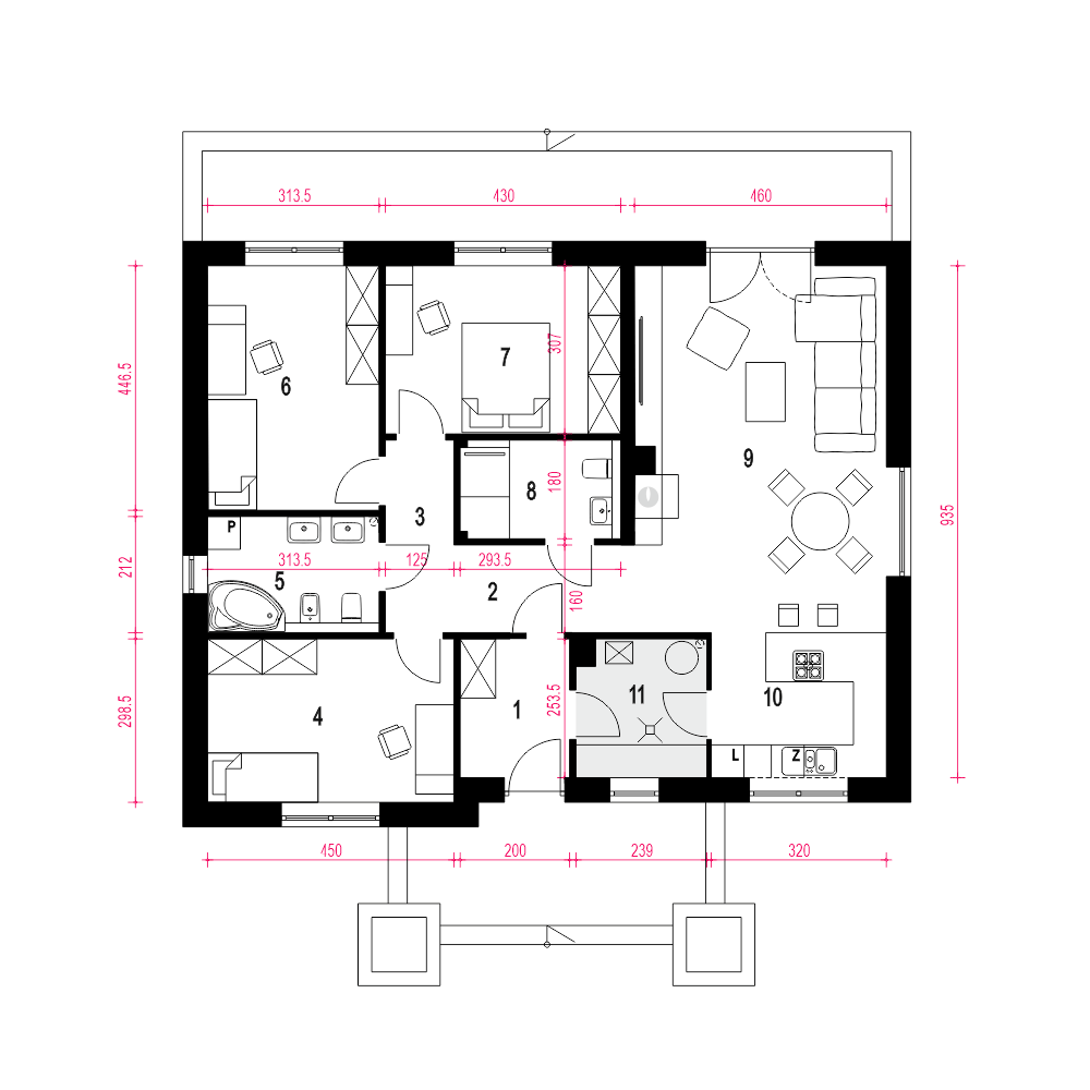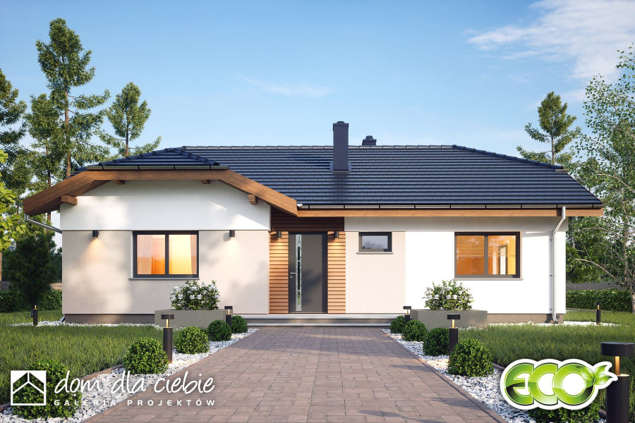 Klara VI wariant B1 to projekt nowoczesnego domu parterowego bez garażu. To projekt domu dla 4ro osobowej rodziny. Dom zaprojektowany jest w technologii murowanej z tradycyjną więźbą dachową, przekryty dachem wielospadowym. Klara VI to funkcjonalny projekt domu parterowego, łączący strefę ogólnodostępną i prywatną na jednym poziomie. Projekt jest kolejną wersją popularnego projektu Klara. W części wejściowej projekt przewiduje wygodny wiatrołap i hol z którego mamy zapewniony dostęp do małej łazienki. Z holu przechodzimy do obszernego salonu z jadalnią, następnie do kuchni z półwyspem. Kuchnia z układem mebli w kształcie litery "U", zapewnia odpowiednią przestrzeń do pracy, a duże frontowe okno doświetla idealnie przestrzeń roboczą. Przy kuchni mamy do dyspozycji spiżarnię która pełni też funkcję pomieszczenia technicznego z piecem CO. Do części prywatnej dostaniemy się przez korytarz dostępny z holu wejściowego. W korytarzu udało się wygospodarować schowek w formie zabudowanej szafy. W części prywatnej mamy do dyspozycji trzy pokoje sypialne i wygodną, wspólną łazienkę z wanną. Klara VI to atrakcyjna propozycja domu energooszczędnego, o nowoczesnym wyglądzie, to projekt domu z serii "eco" - ekonomiczny w budowie i w utrzymaniu - idealna propozycja dla rodzin planujących budowę pierwszego domu.fundamenty: BETONOWE ściany zewnętrzne: POROTHERM+STYROPIAN TERMO ORGANIKA rodzaj stropu: żelbetowy monolityczny elewacje: TYNK STRUKTURALNY, OKŁADZINA DREWNIANA pokrycie dachu: DACHÓWKA CEM. lub CER.