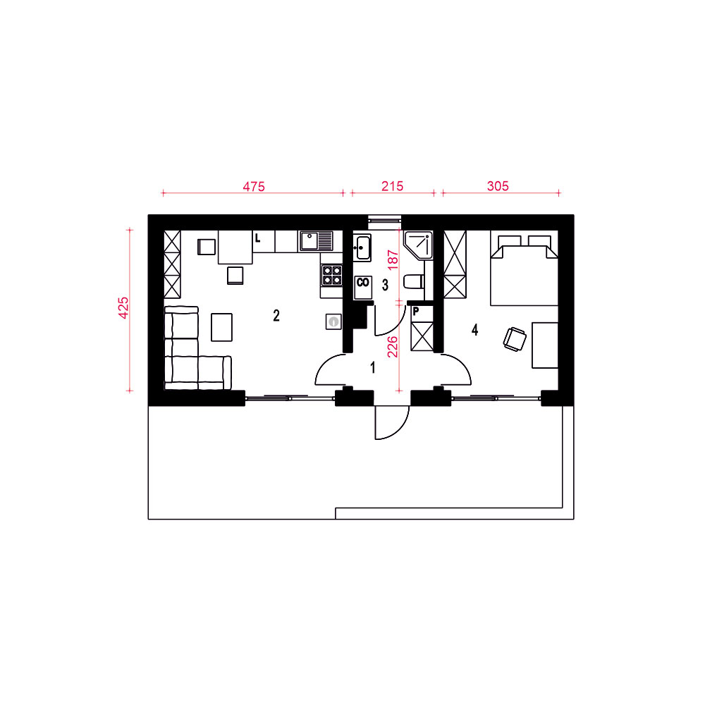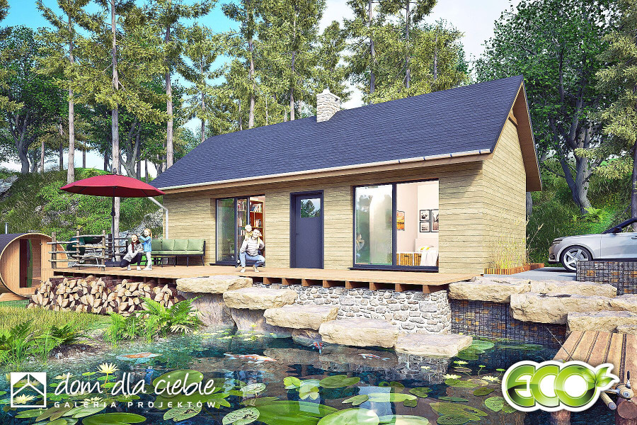 Opieńka to mały, murowany domek weekendowy o dwuspadowym dachu i naturalnej drewnianej elewacji z antracytowymi detalami. Projekt ten skupia się na ekonomicznym podejściu, oferując niewielkie witryny tarasowe dla kontaktu z naturą. Zaledwie 70 m2 powierzchni zabudowy pozwala na harmonijne wkomponowanie się w otoczenie. Wewnątrz znajduje się wiatrołap z szafą, łazienka z prysznicem, niewielka kuchnia, strefa wypoczynkowa z kominkiem oraz miejsce na stół jadalny. Taras stanowi płynne przedłużenie wnętrza na zewnątrz. Opieńka to propozycja ekonomicznego i ekologicznego domu, idealnego na relaksujące weekendy.