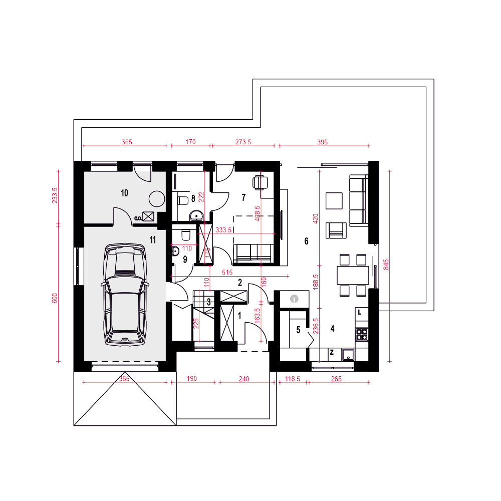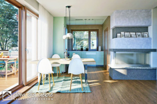 Kołysanka to kompaktowy dom jednorodzinny z poddaszem użytkowym, idealny dla 4–5-osobowej rodziny. Prosta bryła, dwuspadowy dach i elewacja z jasnego tynku oraz beżowego klinkieru nadają mu nowoczesny, a zarazem przytulny charakter. Zadaszone wejście w formie podcienia chroni przed niekorzystną pogodą. Na parterze znajduje się otwarta strefa dzienna z salonem, jadalnią i kuchnią ze spiżarnią. Kominek w centrum salonu tworzy ciepły klimat. Dodatkowy pokój z łazienką może służyć jako gabinet lub sypialnia. Zaplanowano też WC, schowek pod schodami i dostęp do garażu z przejściem do kotłowni z wyjściem na ogród. Poddasze mieści trzy sypialnie oraz przestronną łazienkę z wanną i prysznicem. Duże przeszklenia zapewniają doskonałe doświetlenie i otwierają dom na ogród. Projekt łączy elegancję z funkcjonalnością i sprawdzi się zarówno na działce podmiejskiej, jak i w spokojnym, naturalnym otoczeniu.fundamenty: BETONOWE ściany zewnętrzne: POROTHERM+STYROPIAN TERMO ORGANIKA ściany wewnętrzne: POROTHERM rodzaj stropu: TERIVA elewacje: TYNK STRUKTURALNY, CEGŁA KLINKIEROWA pokrycie dachu: DACHÓWKA CERAMICZNA