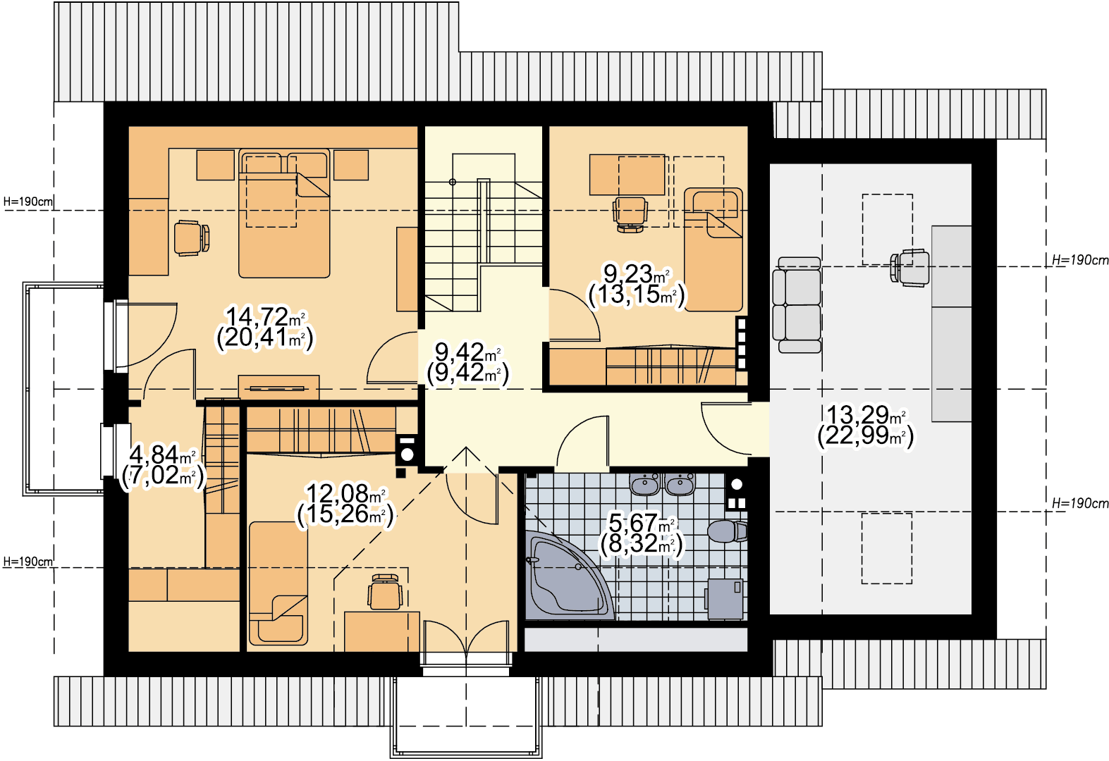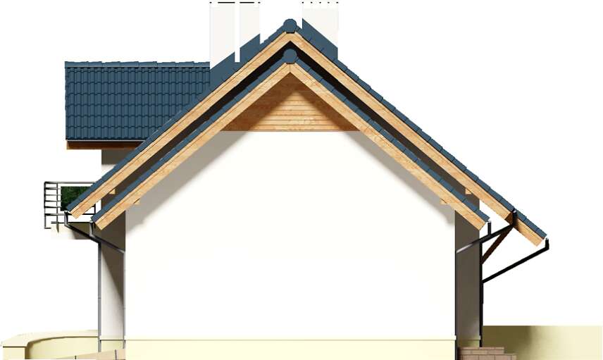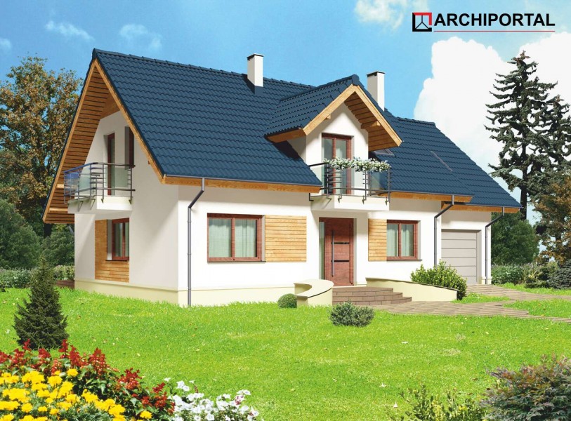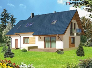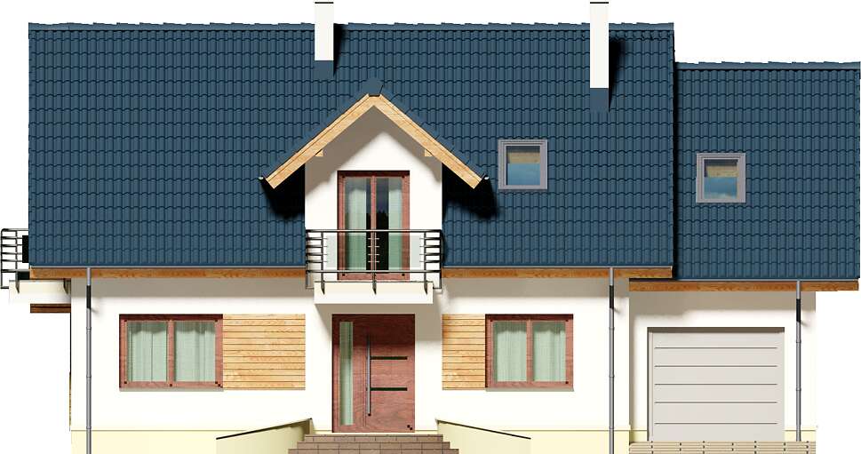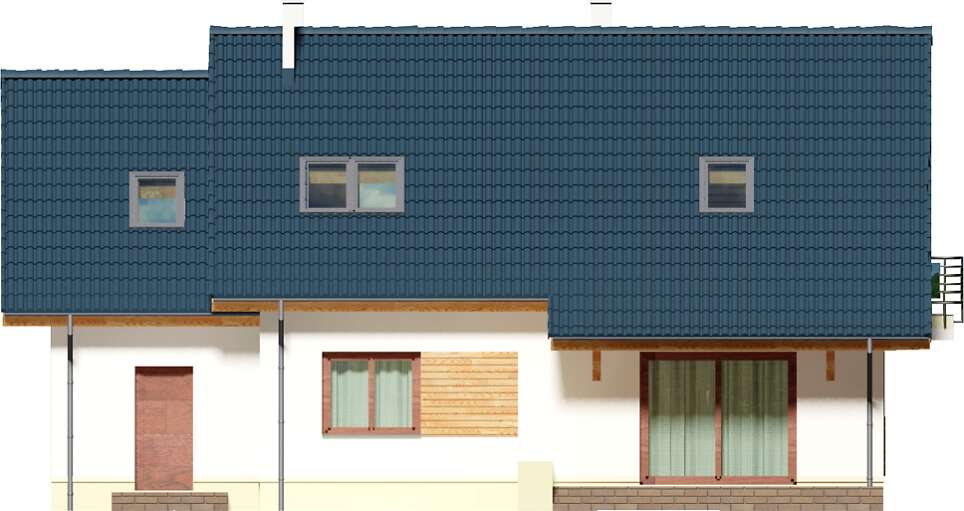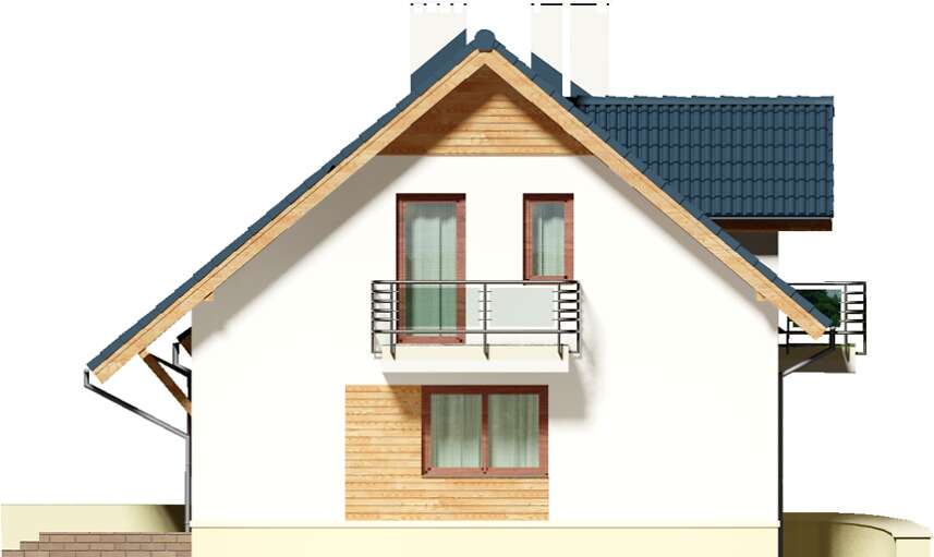 Poddasze to klasyczna strefa nocna, trzy ustawne pokoje oraz łazienka. Dwa pokoje mają bezpośrednie wyjście na balkon, a główna sypialnia posiada własną, przestronną garderobę. Pomieszczenia zostały tak zaprojektowane, że w każdym zmieści się ciąg praktycznych szaf i mebli, prawdziwym atutem jest jednak pomieszczenie nad garażem, do którego dostajemy się bezpośredni z korytarza. Można je zaadoptować na strych, pokój hobby lub po prostu dodatkowe pomieszczenie mieszkalne. Elewacja budynku została zaprojektowana w nowoczesnym stylu z modną okładziną drewnianą, dom można jednak wykończyć także w sposób klasyczny.