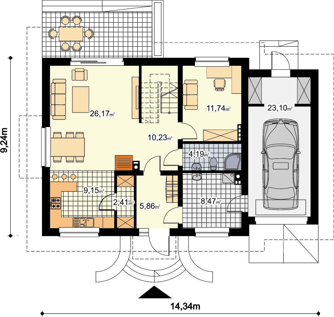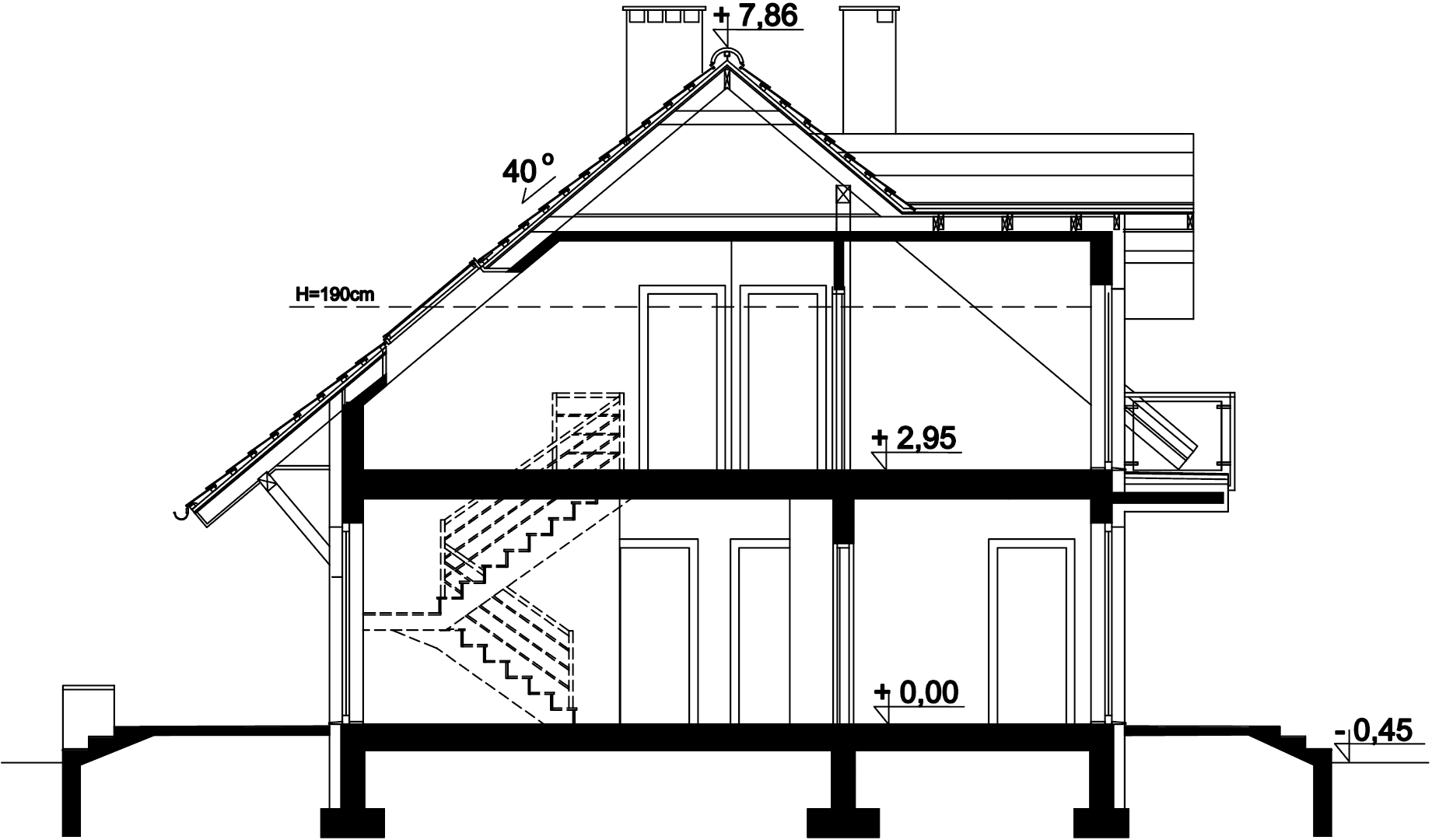 Klasyczny dom w nowoczesnej aranżacji przeznaczony dla 4-5 osobowej rodziny. Zaletą parteru jest przestronny salon połączony z otwartą kuchnią, którą w razie potrzeby można oddzielić od pokoju dziennego ścianką działową. Centralne położenie kominka ułatwi ogrzanie budynku zimą. W bezpośrednim sąsiedztwie kuchni znajduje się praktyczna spiżarnia, kolejnym atutem jest dodatkowy pokój na parterze, z widokiem na ogród. Może on pełnić rolę gabinetu lub pokoju gościnnego. Duże okna i drzwi balkonowe sprawiają, że wnętrza są dobrze oświetlone i przytulne. Ogromną zaletą jest także duża kotłownia, przez którą dostajemy się do garażu. Jej rozmiary pozwalają na zmianę ogrzewania np. na paliwo stałe. W garażu jest dostateczna ilość miejsca na doprojektowanie dodatkowego pomieszczenia gospodarczego z przeznaczeniem na schowek narzędzi ogrodowych lub skład opału.