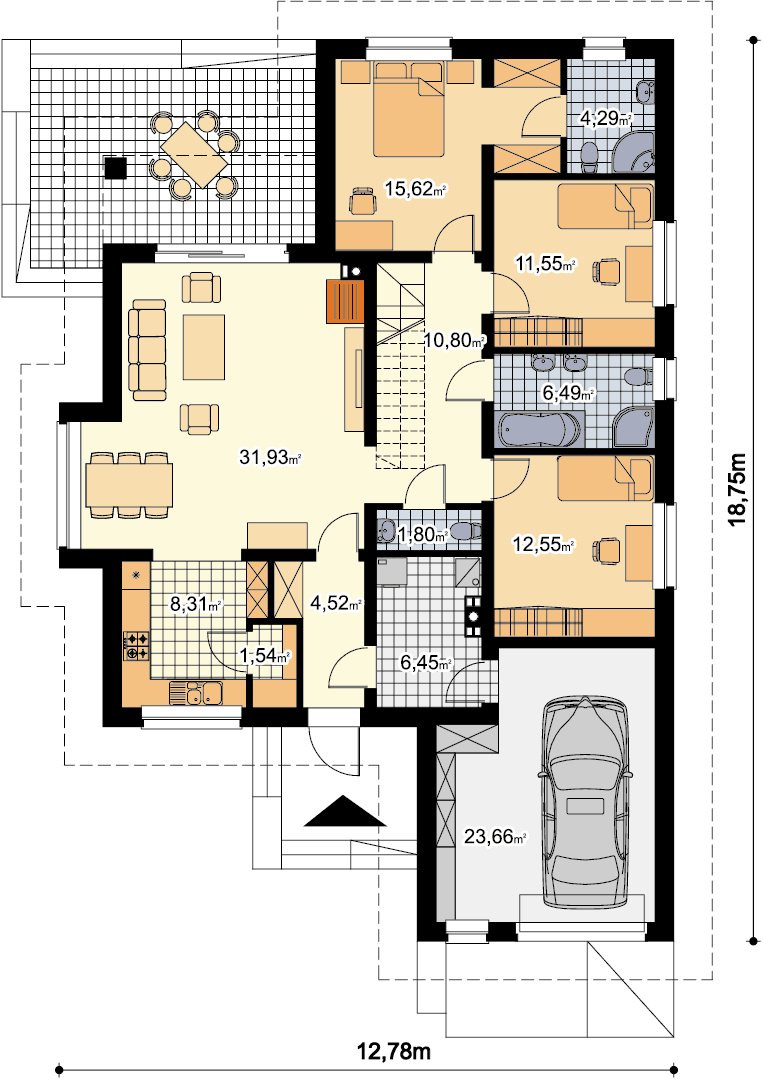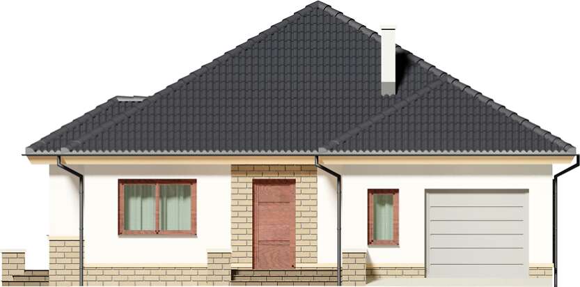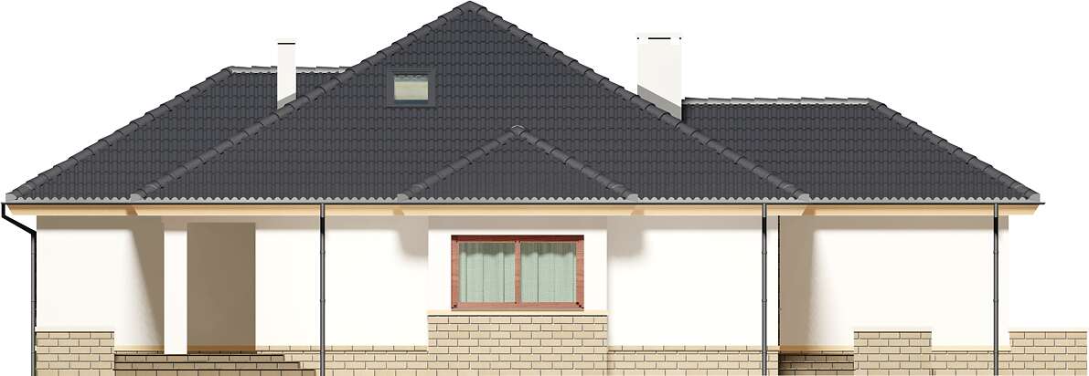 Projekt klasycznego domu z dwuspadowym dachem. Zaletą parteru jest przestronny, dobrze oświetlony salon z ciekawym wykuszem jadalnym, ustawna kuchnia, którą w razie potrzeby można w prosty sposób oddzielić ścianką od pokoju dziennego, dodatkowy pokój gościnny/gabinet oraz kotłownia, której rozmiary pozwalają na zastosowanie praktycznie dowolnego rodzaju paliwa. Centralne położenie kominka doskonale sprawdza się podczas ogrzewania tego niewielkiego domku w długie, zimowe wieczory. Na piętrze znalazły się 3 ustawne pokoje, każdy z wyjściem na balkon oraz łazienka, w której bez trudu zmieści się wanna i prysznic. Dodatkowo, sypialnia rodziców połączona jest z wygodną, otwartą garderobą. Dzięki prostej, nieskomplikowanej bryle, małej powierzchni dachu, dom jest tani w budowie i późniejszej eksploatacji.