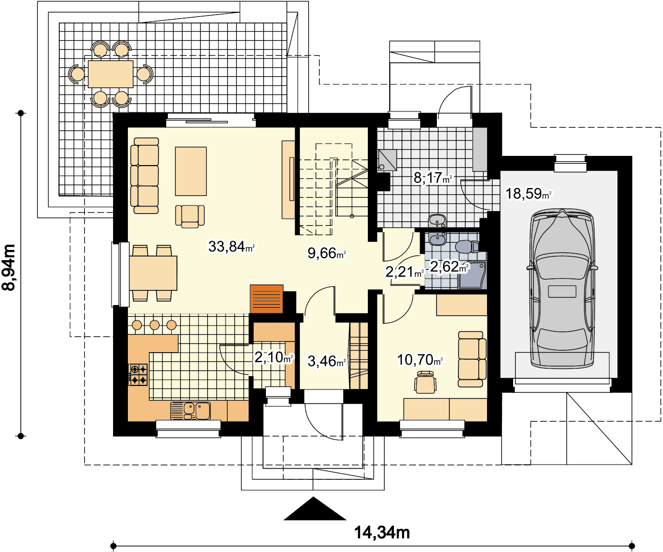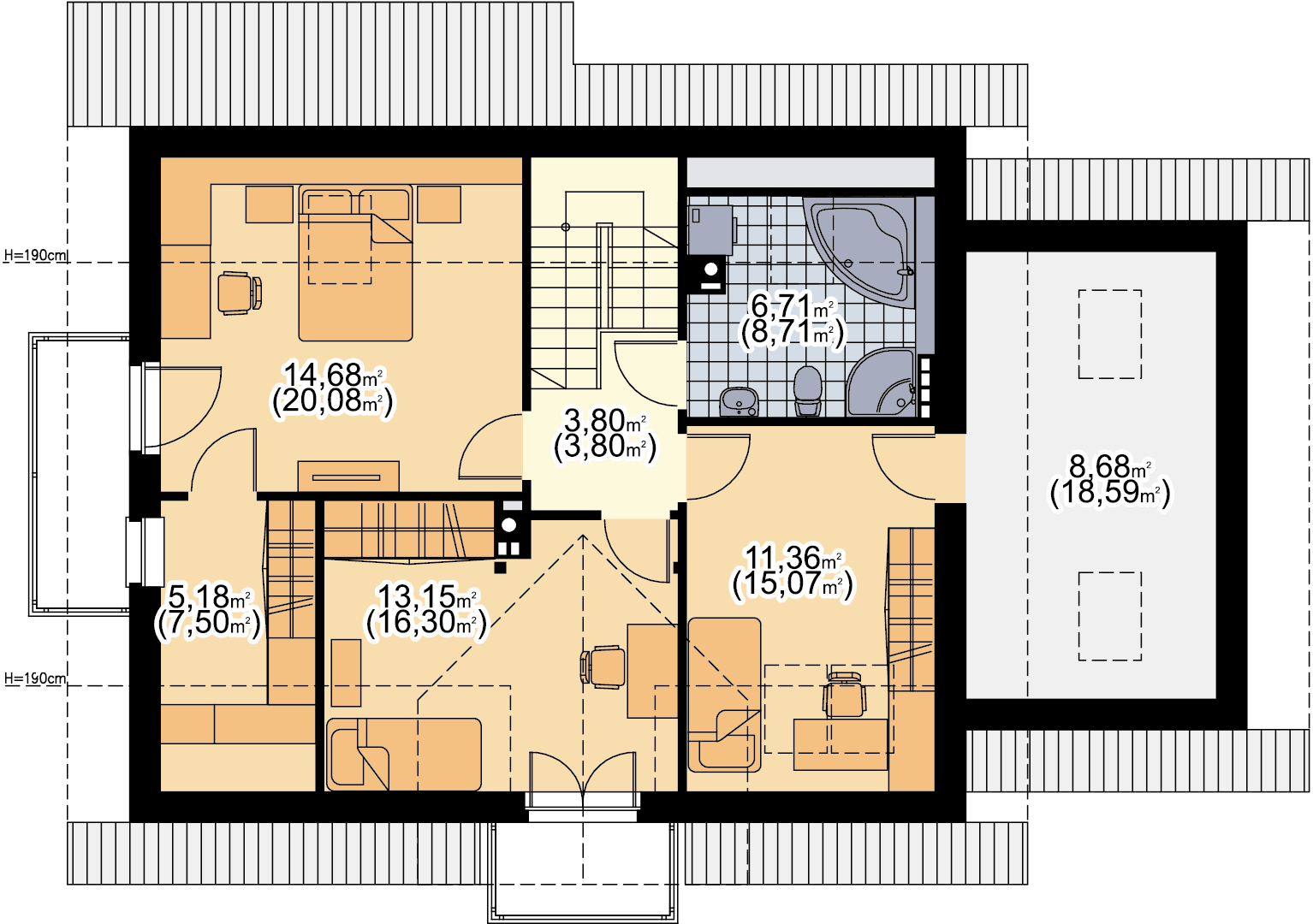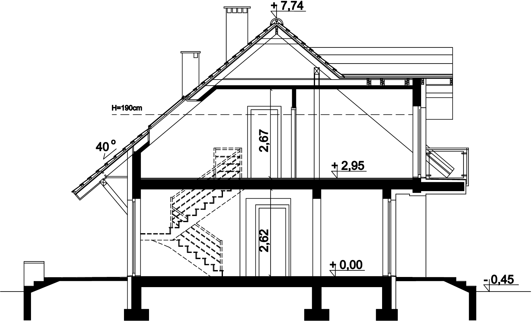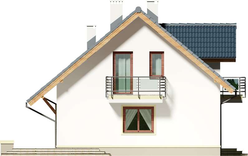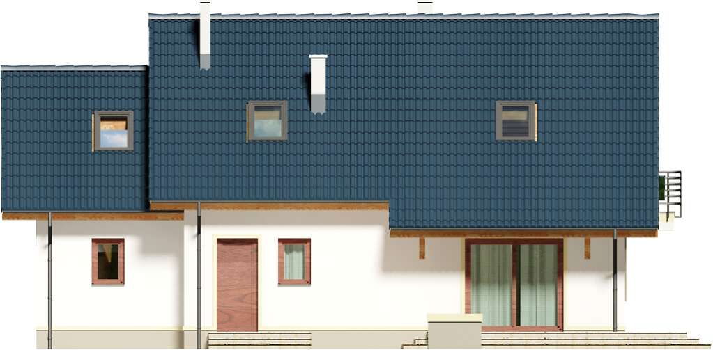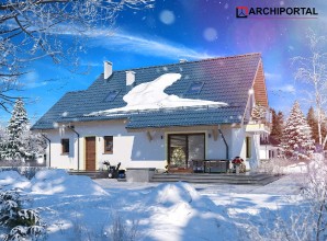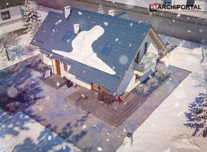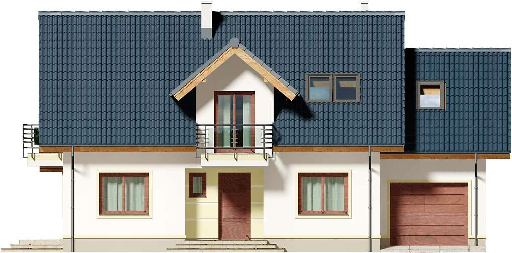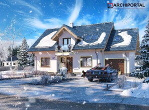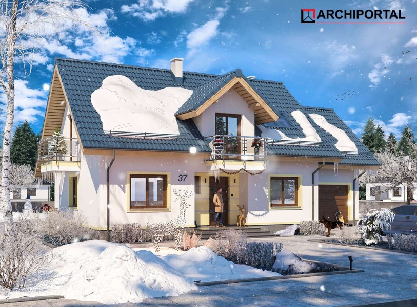 Klasyczny dom w nowoczesnej aranżacji. Zaletą parteru jest otwarta, kuchnia, praktyczna spiżarnia, duże pomieszczenie gospodarcze z bezpośrednim dostępem do ogrodu oraz dodatkowy pokój z przeznaczeniem na gabinet lub pokój gościnny. W ramach adaptacji można zabudować kuchnię, oddzielając ją od pokoju dziennego. Centralne położenie kominka doskonale sprawdza się podczas ogrzewania tego niewielkiego domku w długie, zimowe wieczory. Na piętrze znajdują się trzy ustawne pokoje, oraz duża łazienka z miejscem na wannę i prysznic. Dwa pokoje posiadają własny balkon, dodatkowo sypialnia rodziców połączona jest z przestronną i jasną garderobą. Kolejnym atutem jest pomieszczenie nad garażem dostępne z jednego z pokojów, które może być zaadoptowane na strych, pralnię lub dodatkowy pokój. Ten urokliwy domek zwraca uwagę gustownym podcieniem wejściowym, zwieńczonym klasyczną lukarną, a nieskomplikowana bryła i prosty dach, powodują, że jest on tani w budowie i późniejszej eksploatacji.