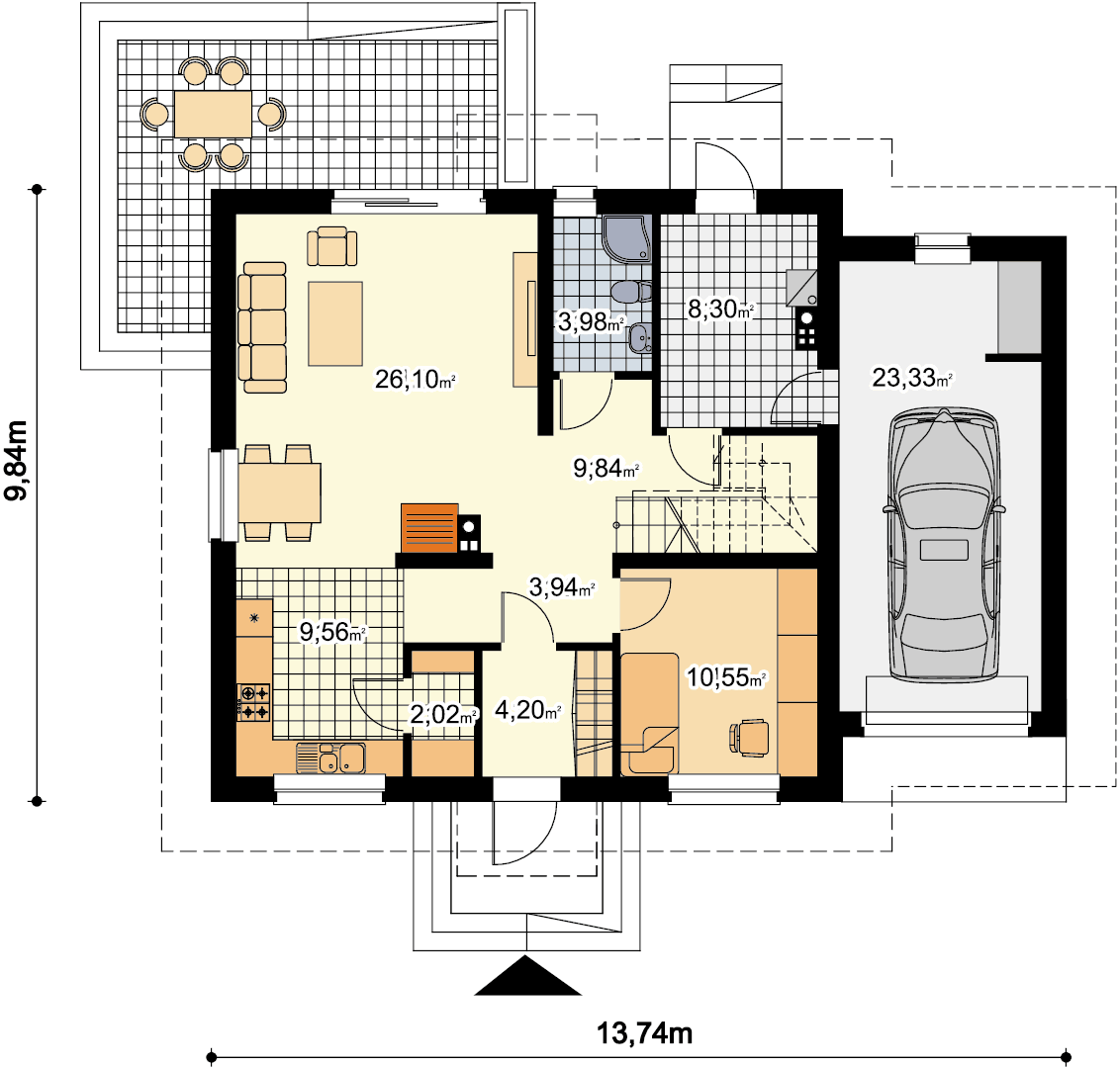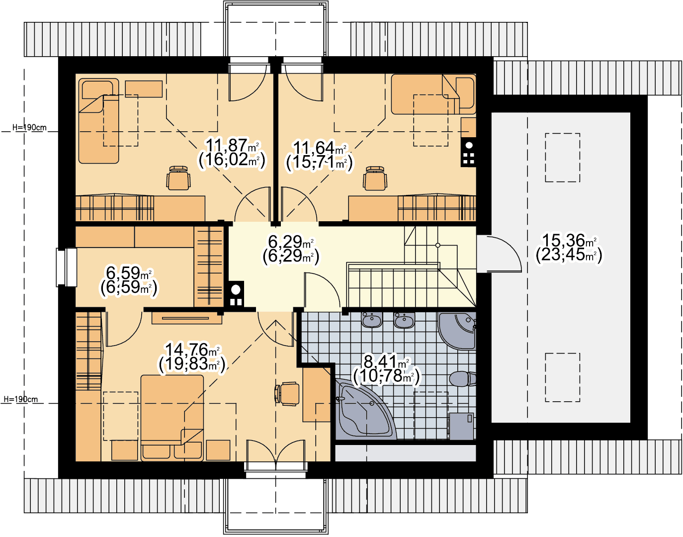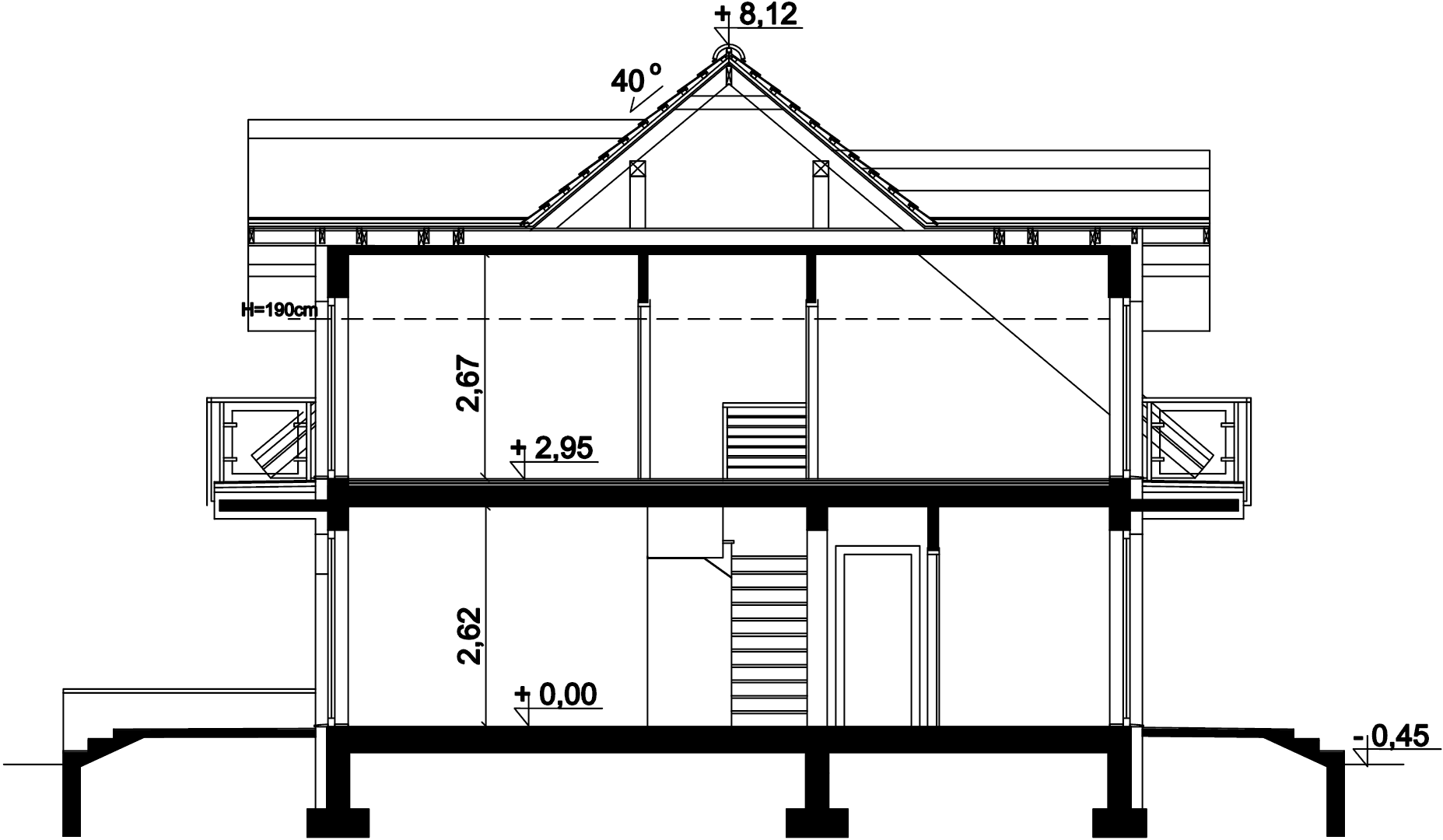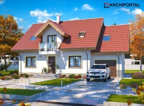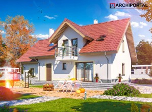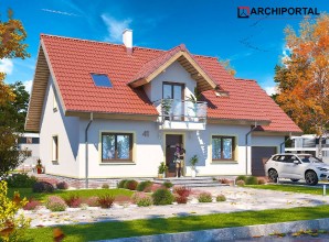 Klasyczny dom z dwuspadowym dachem. Zaletą parteru jest przestronny salon z centralnie umieszczonym kominkiem, otwarta kuchnia, jasna łazienka, pojemne pomieszczenie gospodarcze z bezpośrednim dostępem do ogrodu, oraz dodatkowy pokój z przeznaczeniem na gabinet lub pokój gościnny. W ramach adaptacji można zabudować kuchnię, oddzielając ją od pokoju dziennego. Na piętrze znalazły się: sporych rozmiarów łazienka, z miejscem na wannę i prysznic oraz 3 ustawne pokoje, każdy z wyjściem na balkon. Sypialnia rodziców połączona jest bezpośrednio z dużą garderobą pozbawioną skosów, dzięki temu może być ona w pełni zabudowana przez praktyczne szafy. Kolejnym atutem jest pomieszczenie nad garażem dostępne ze spocznika schodów, które można zaadoptować na strych, pralnię lub dodatkowy pokój. Dzięki prostej, nieskomplikowanej bryle dom jest tani w budowie i późniejszej eksploatacji.