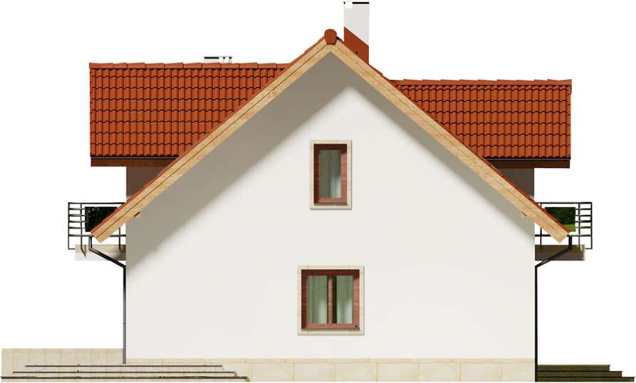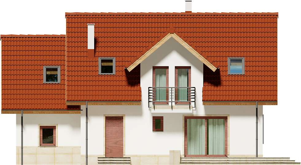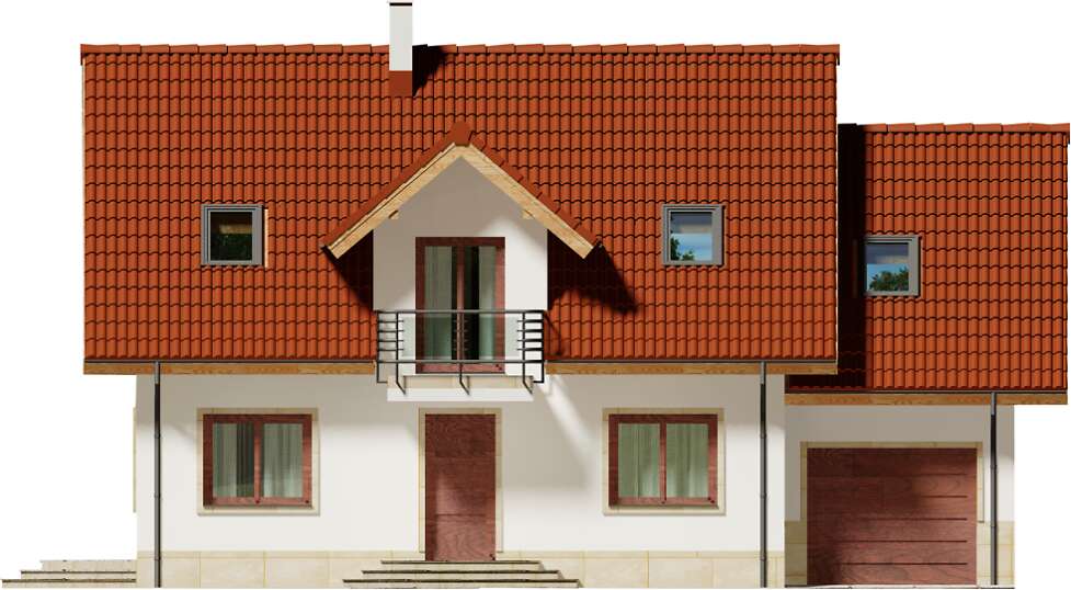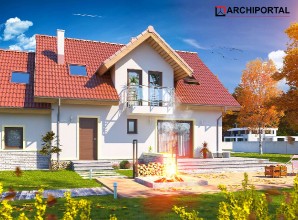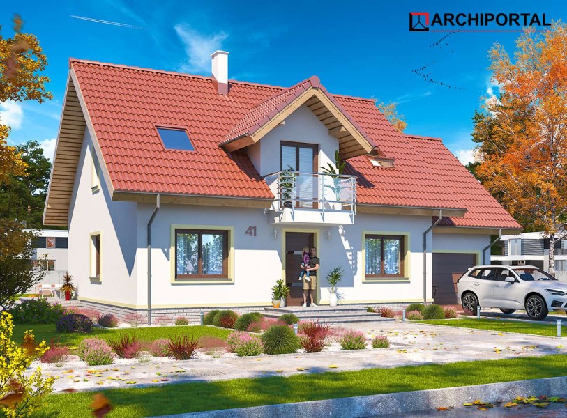 Klasyczny dom z dwuspadowym dachem. Zaletą parteru jest przestronny salon z centralnie umieszczonym kominkiem, otwarta kuchnia, jasna łazienka, pojemne pomieszczenie gospodarcze z bezpośrednim dostępem do ogrodu, oraz dodatkowy pokój. W ramach adaptacji można zabudować kuchnię, oddzielając ją od pokoju dziennego. W projekcie przewidziano ogrzewanie na paliwo stałe, a duży garaż pozwala na wydzielenie dodatkowego pomieszczenia z przeznaczeniem np. na skład opału. Na piętrze znalazły się: sporych rozmiarów łazienka, z miejscem na wannę i prysznic oraz 3 ustawne pokoje, każdy z wyjściem na balkon. Sypialnia rodziców połączona jest bezpośrednio z dużą garderobą pozbawioną skosów, dzięki temu może być ona w pełni zabudowana przez praktyczne szafy. Kolejnym atutem jest pomieszczenie nad garażem dostępne ze spocznika schodów, które można zaadoptować na strych, pralnię lub dodatkowy pokój. Dzięki prostej, nieskomplikowanej bryle dom jest tani w budowie i późniejszej eksploatacji.
