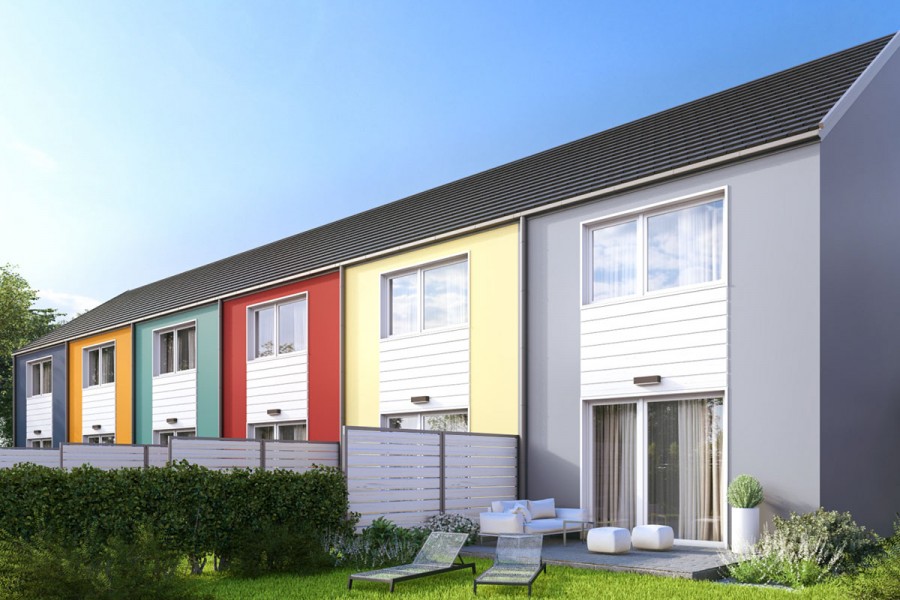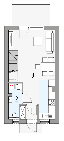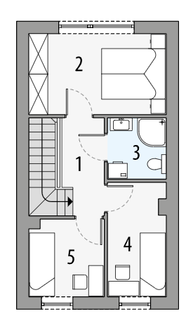 Ten kompaktowy, piętrowy dom został zaprojektowany z myślą o działkach o ograniczonej szerokości. Jego prosta, zwarta bryła pozwala na efektywne zagospodarowanie przestrzeni, zarówno wewnątrz budynku, jak i na działce. Na parterze przewidziano otwartą strefę dzienną, która łączy kuchnię z salonem, a także dodatkową łazienkę i miejsce na przechowywanie. Dzięki przemyślanemu układowi, mimo niewielkiej powierzchni, wnętrze pozostaje przestronne i dobrze doświetlone.