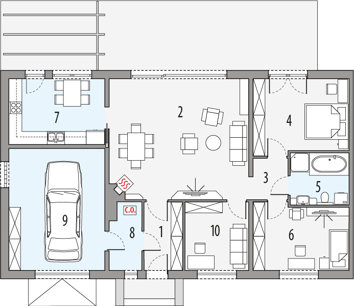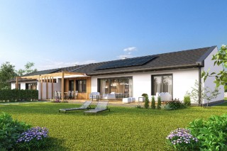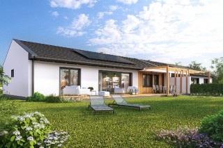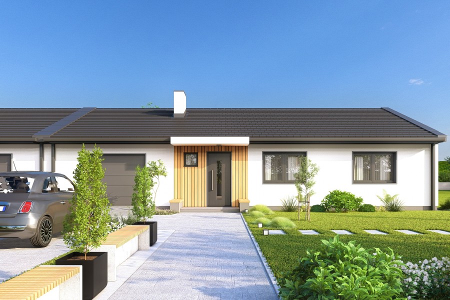 Projekt Simple 2 to nowoczesny i funkcjonalny dom w zabudowie bliźniaczej lub jako dom dwulokalowy. Parterowy układ obejmuje przestronny salon z jadalnią, oddzielną kuchnię, trzy wygodne sypialnie, łazienkę, dodatkowe wc, kotłownię oraz garaż. Przemyślany rozkład pomieszczeń pozwala na wygodne życie rodziny, a duże przeszklenia doświetlają wnętrza i otwierają dom na ogród.