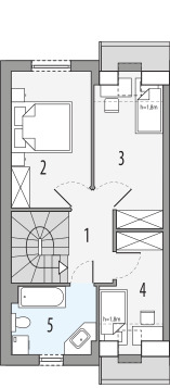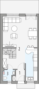Na parterze znajduje się również wygodna, częściowo otwarta kuchnia, idealna do codziennego gotowania i spotkań przy wspólnych posiłkach, oraz mała toaleta dla wygody domowników i gości. Dodatkowa przestrzeń pod schodami zapewnia miejsce na przechowywanie niezbędnych rzeczy, co pozwala utrzymać porządek i funkcjonalność pomieszczeń.