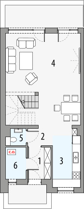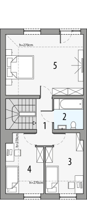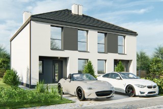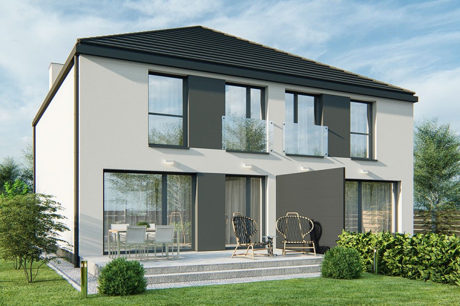 Projekt budynku dwulokalowego lub bliźniaka. Charakterystyczna cechą tego budynku jest ograniczenie skosów na poddaszu, co daje większą przestrzeń użytkową i wrażenie pełnego piętra.